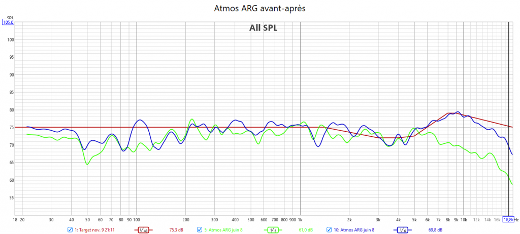 A l’écoute, le gain en clarté place mieux les effets sonores dans l’espace. L’alignement des niveaux donne une bonne bulle sonore bien équilibrée. Le rendu est plus détaillé et précis. Les atmos sont bien présentes (avec une source de qualité). La centrale est plus intelligible même sans l’amélioration des dialogues. Pas de risque d’agressivité grâce au contrôle des aigus par la courbe cible. Le grave, avec un rendu propre, gagne en linéarité.