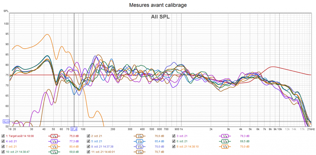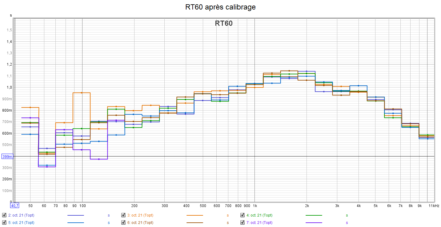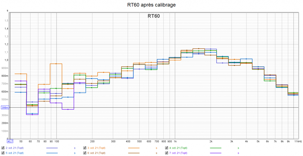 Le RT60 (temps de réverbération) dépasse les 1,1 secondes pour l’aigu ce qui est beaucoup. Une grande partie de la réponse est au-dessus des 800 millisecondes. L’objectif serait de ne pas dépasser 400 ms, pour avoir un rendu à la hauteur des Sonus Faber. L’acoustique, c’est 50% du rendu. Mais la pièce n’étant pas encore totalement aménagée, ça ne peut que s’améliorer.