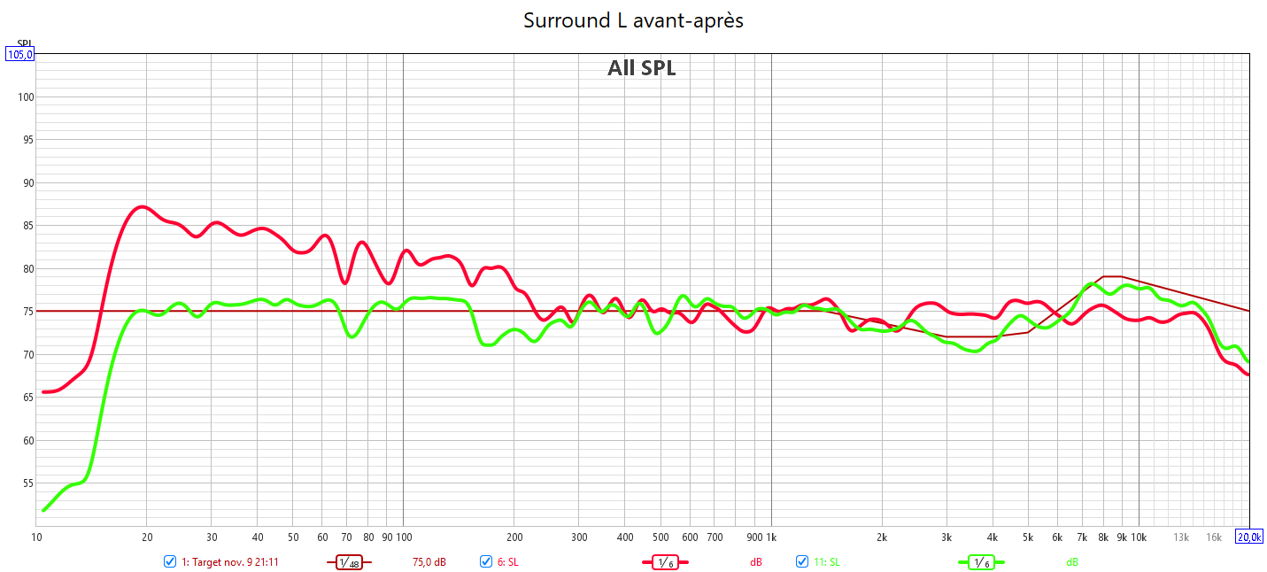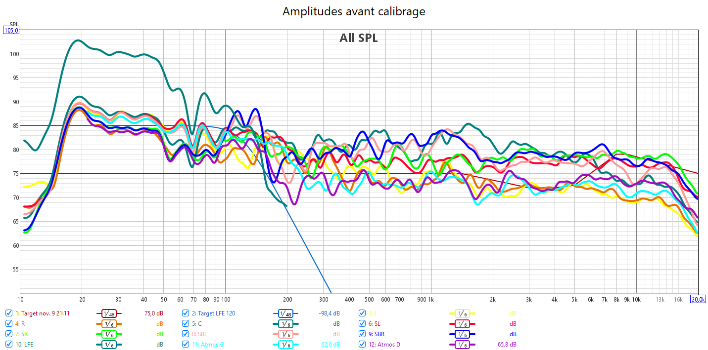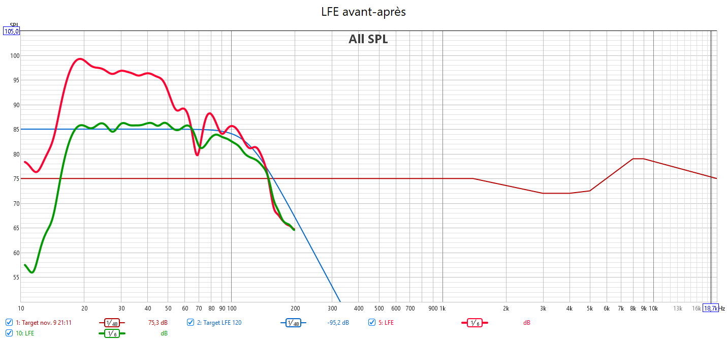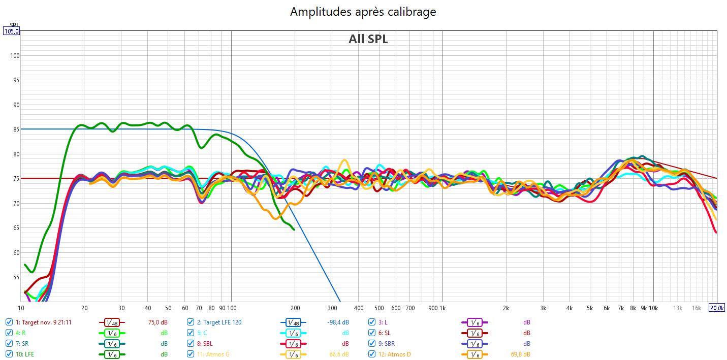 Après calibrage : j’ai calé la réponse des enceintes suivant une nouvelle courbe cible prenant en compte la sensibilité de l’oreille. J’obtiens les mêmes réponses et les mêmes niveaux sonores, ce qui assure l’équilibre de la bulle sonore avec clarté. 𝗟𝗲 𝗗𝘆𝗻𝗮𝗺𝗶𝗰𝗘𝗤 𝗲𝘀𝘁 𝗱𝗲́𝘀𝗮𝗰𝘁𝗶𝘃𝗲́ 𝗲𝘁 𝗱𝗼𝗶𝘁 𝘆 𝗿𝗲𝘀𝘁𝗲𝗿 𝗽𝗼𝘂𝗿 𝗹𝗲 𝗵𝗼𝗺𝗲 𝗰𝗶𝗻𝗲́𝗺𝗮. 𝗖’𝗲𝘀𝘁 𝗽𝗿𝗶𝗻𝗰𝗶𝗽𝗮𝗹𝗲𝗺𝗲𝗻𝘁 𝘂𝗻 𝗹𝗼𝘂𝗱𝗻𝗲𝘀𝘀, 𝗺𝗮𝗶𝘀 𝗶𝗹 𝗱𝗲́𝘀𝗲́𝗾𝘂𝗶𝗹𝗶𝗯𝗿𝗲 𝗹𝗮 𝗯𝘂𝗹𝗹𝗲 𝘀𝗼𝗻𝗼𝗿𝗲 𝗲𝗻 𝗿𝗲𝗹𝗲𝘃𝗮𝗻𝘁 𝗹𝗲𝘀 𝗰𝗮𝗻𝗮𝘂𝘅 𝗮𝗿𝗿𝗶𝗲̀𝗿𝗲. Le LFE a maintenant une réponse bien plus homogène et linéaire jusqu’à 120Hz (norme LFE). Le placement simple des caissons a simplifié la tâche d’Audyssey pour aligner les caissons. Chose qu’il ne sait pas toujours faire correctement.
