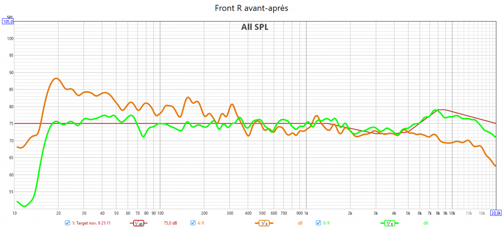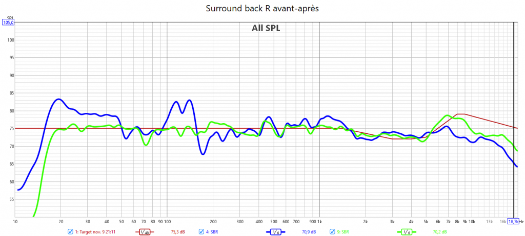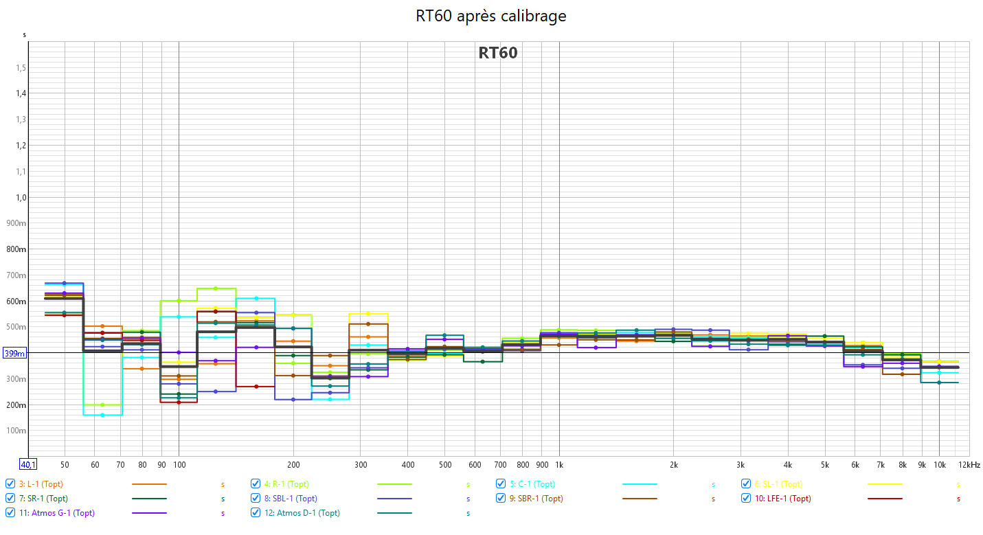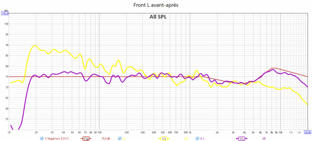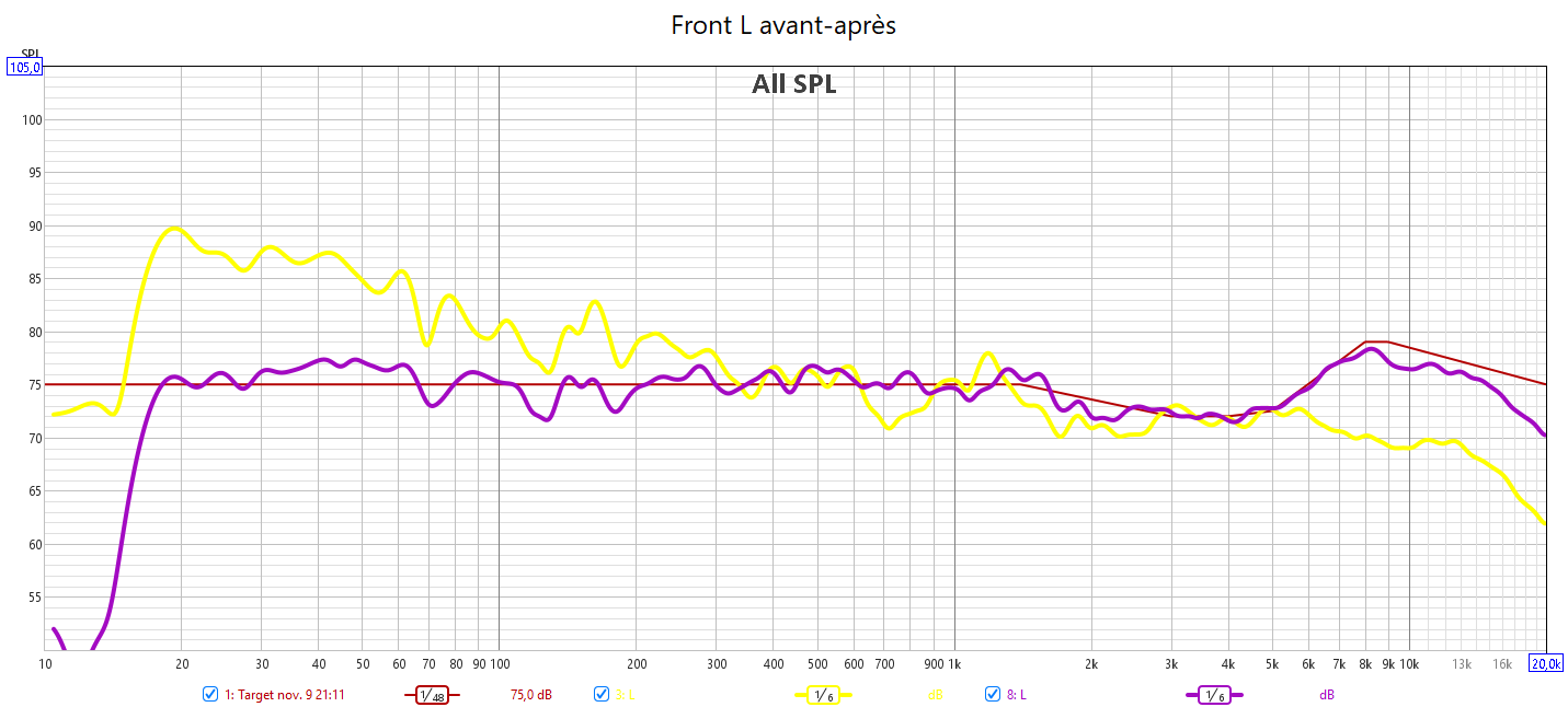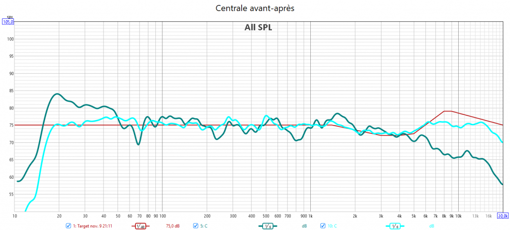 Après calibrage : j’ai calé la réponse des enceintes suivant une nouvelle courbe cible prenant en compte la sensibilité de l’oreille. J’obtiens les mêmes réponses et les mêmes niveaux sonores, ce qui assure l’équilibre de la bulle sonore avec clarté. 𝗟𝗲 𝗗𝘆𝗻𝗮𝗺𝗶𝗰𝗘𝗤 𝗲𝘀𝘁 𝗱𝗲́𝘀𝗮𝗰𝘁𝗶𝘃𝗲́ 𝗲𝘁 𝗱𝗼𝗶𝘁 𝘆 𝗿𝗲𝘀𝘁𝗲𝗿 𝗽𝗼𝘂𝗿 𝗹𝗲 𝗵𝗼𝗺𝗲 𝗰𝗶𝗻𝗲́𝗺𝗮. 𝗖’𝗲𝘀𝘁 𝗽𝗿𝗶𝗻𝗰𝗶𝗽𝗮𝗹𝗲𝗺𝗲𝗻𝘁 𝘂𝗻 𝗹𝗼𝘂𝗱𝗻𝗲𝘀𝘀, 𝗺𝗮𝗶𝘀 𝗶𝗹 𝗱𝗲́𝘀𝗲́𝗾𝘂𝗶𝗹𝗶𝗯𝗿𝗲 𝗹𝗮 𝗯𝘂𝗹𝗹𝗲 𝘀𝗼𝗻𝗼𝗿𝗲 𝗲𝗻 𝗿𝗲𝗹𝗲𝘃𝗮𝗻𝘁 𝗹𝗲𝘀 𝗰𝗮𝗻𝗮𝘂𝘅 𝗮𝗿𝗿𝗶𝗲̀𝗿𝗲. Le LFE a maintenant une réponse bien plus homogène et linéaire jusqu’à 120Hz (norme LFE). Le placement simple des caissons a simplifié la tâche d’Audyssey pour aligner les caissons. Chose qu’il ne sait pas toujours faire correctement.