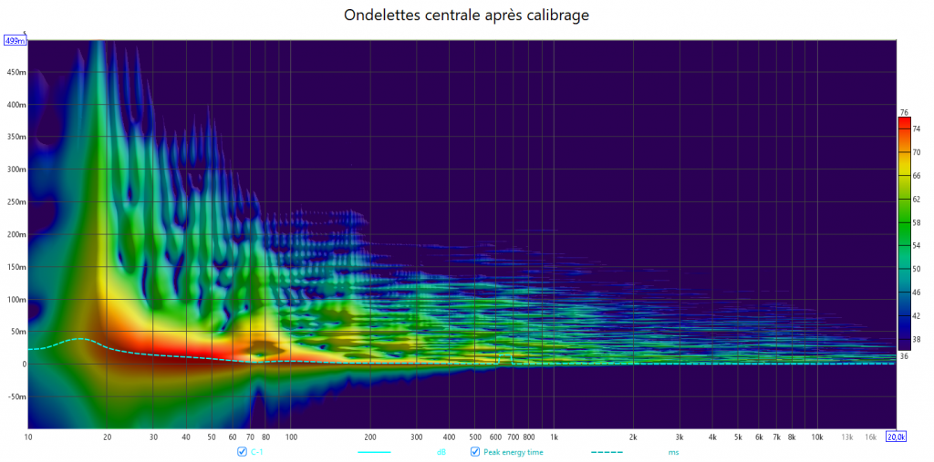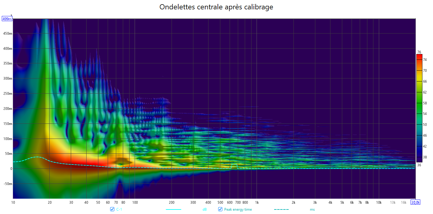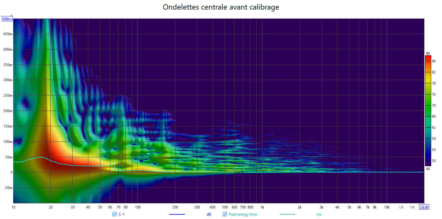 Avant calibrage, on visualise bien sur le relevé des ondelettes (ici de la centrale) le retard du LFE d’une quinzaine de millisecondes. Audyssey ne sait pas le corriger.