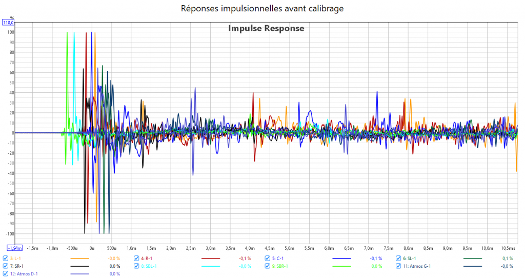 Avant calibrage, les mesures montrent de grosses différences de niveaux entre les différents canaux. La bulle sonore n’est pas équilibrée. En partie à cause du DynamicEQ qui relève les canaux arrière au détriment de l’avant. La centrale est aussi plus forte. 7dB supérieur aux frontales droite et gauche. Cette pratique de relever la centrale est à bannir. Je pourrais dire aussi que les frontales droites et gauches sont sous la centrale de 7dB. Cela explique pourquoi on capte peu d’informations des LR. Les surround sont aussi trop fortes tout comme le LFE largement trop dosé de plus de 10dB. D’où l’inaudibilité de certains films dans le grave.