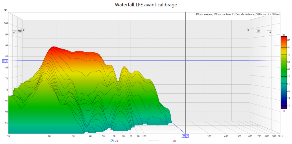 Avant calibrage, la réponse du LFE est atypique avec un palier à 50Hz, ce qui déséquilibre le grave en rendant la plage 50-120Hz inaudible, bien visible sur le Waterfall. Sans parler de la perte de dynamisme. 𝗟𝗲𝘀 𝗳𝗿𝗲́𝗾𝘂𝗲𝗻𝗰𝗲𝘀 𝗶𝗺𝗽𝗮𝗰𝘁𝗮𝗻𝘁𝗲𝘀 𝘀𝗼𝗻𝘁 𝗮𝘂-𝗱𝗲𝘀𝘀𝘂𝘀 𝗱𝗲 𝟰𝟬𝗛𝘇.