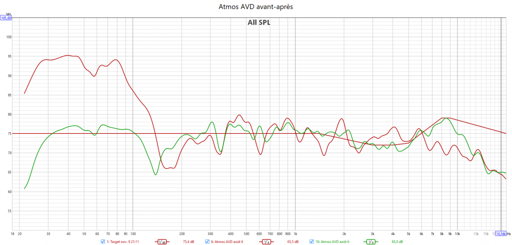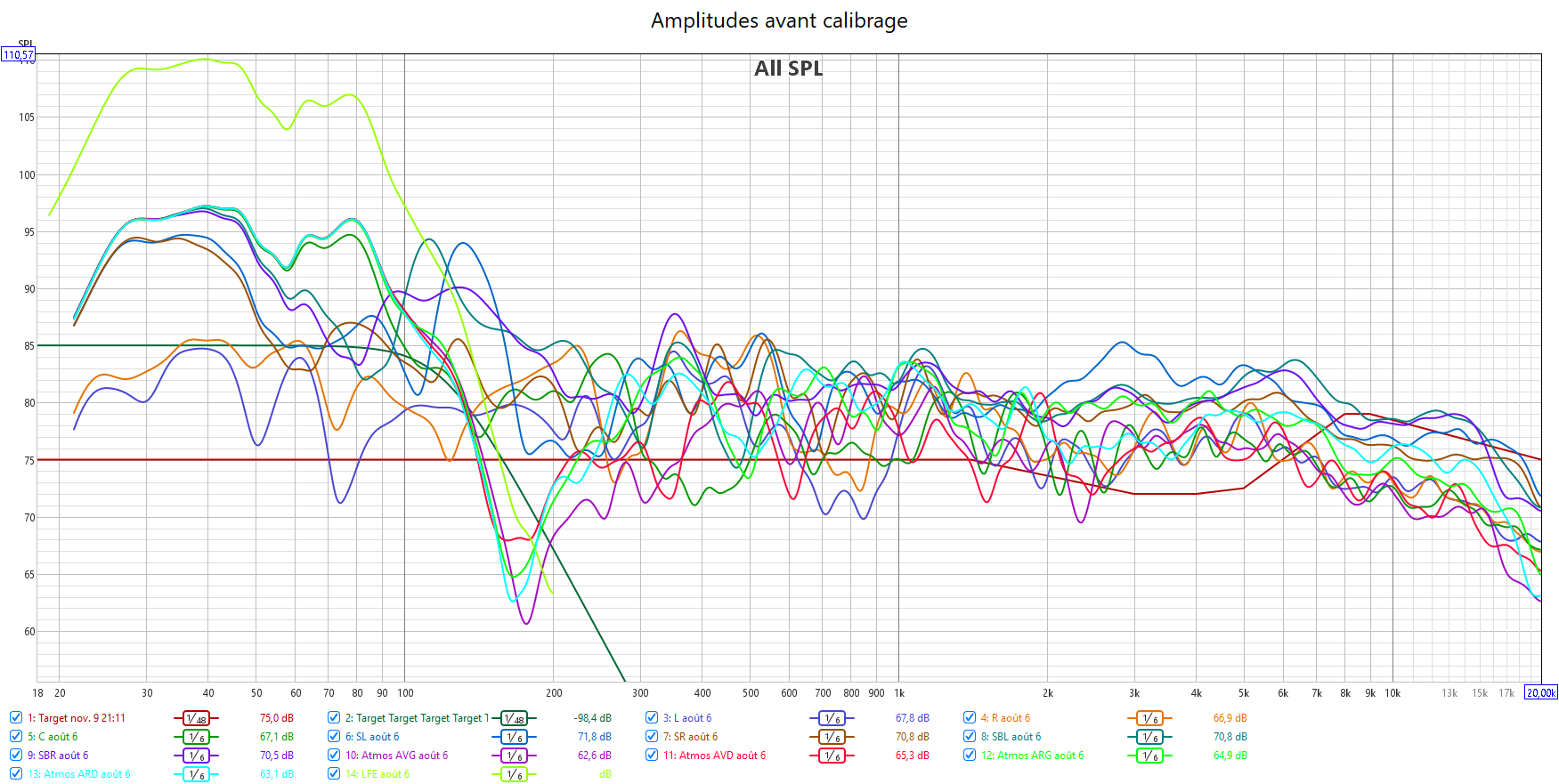Avant calibrage, je retrouve sur les mesures en amplitudes l’excès de grave que j’avais entendu lors des première écoutes. Le Dynamic EQ activé n’arrange pas les choses. Il crée aussi un déséquilibre dans la bulle sonore en augmentant les niveaux de tous les canaux sauf la scène frontale et les atmos avant. La surround gauche a de la distorsion dans l’aigu (défaut du tweeter) ce qui la rend plus agressive que les autres enceintes. L’extrême aigu chute prématurément provoquant une perte de clarté. C’est souvent le même constat. L’alignement temporel (réglage des distances) tient dans une fourchette d’ 1 milliseconde. Je ferais mieux après calibrage, mais ce n’est pas ce qui va changer grandement le rendu. C’est principalement le changement de la courbe cible. Audyssey a mis les colonnes en « Grande », ce qui n’est pas forcément judicieux.