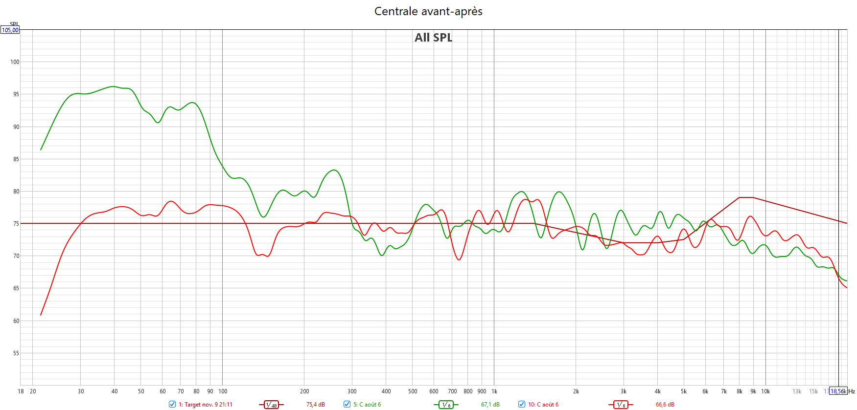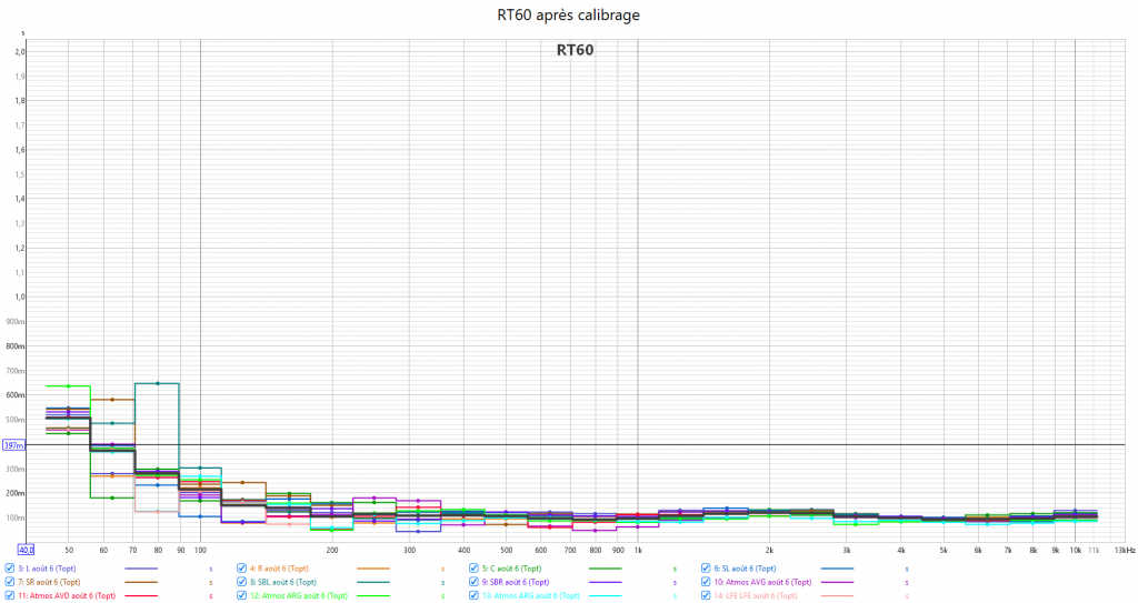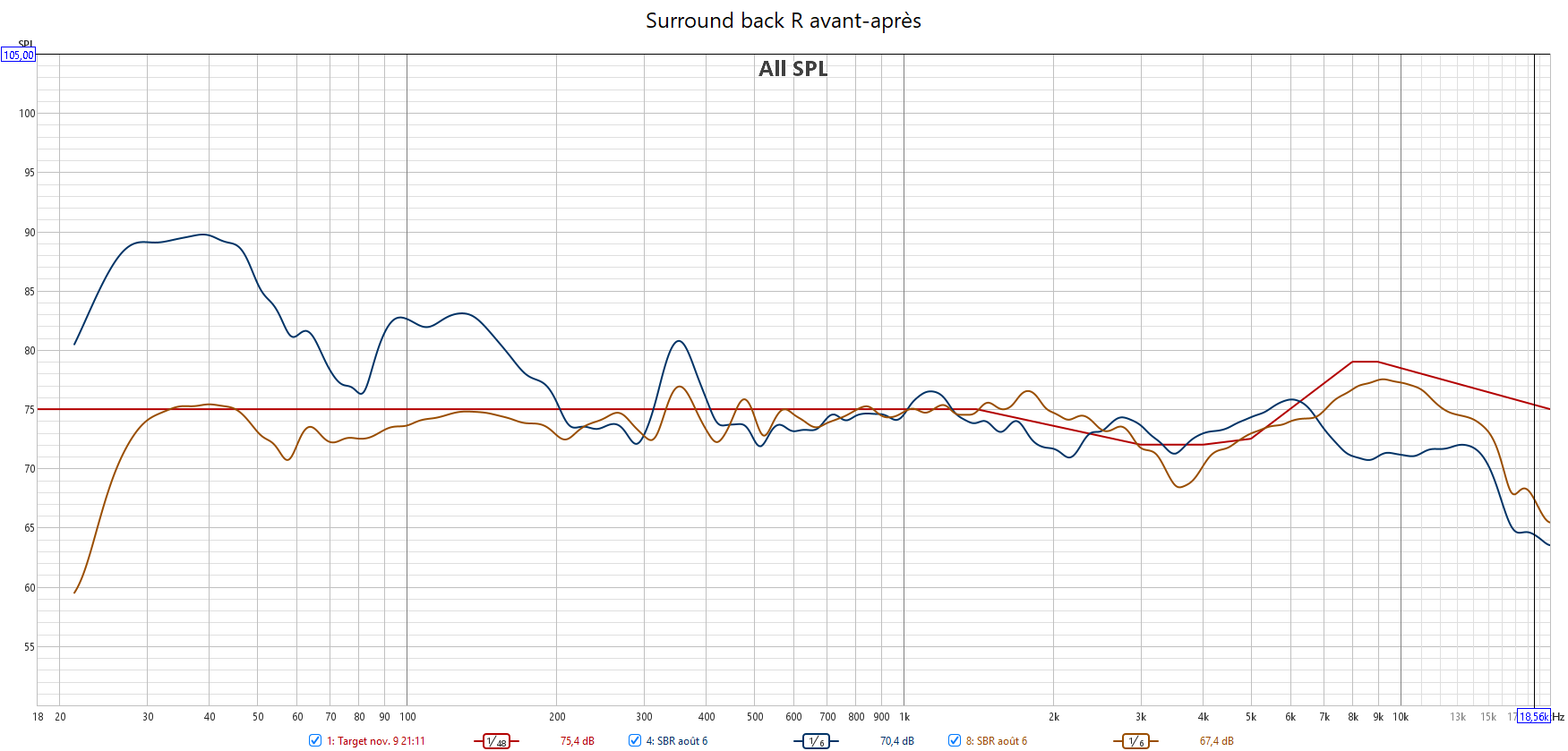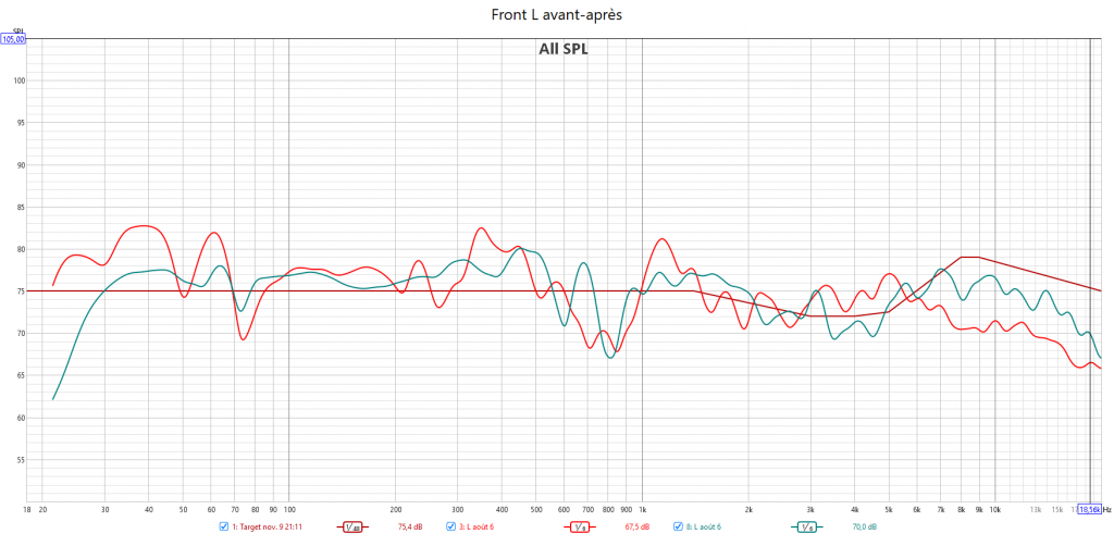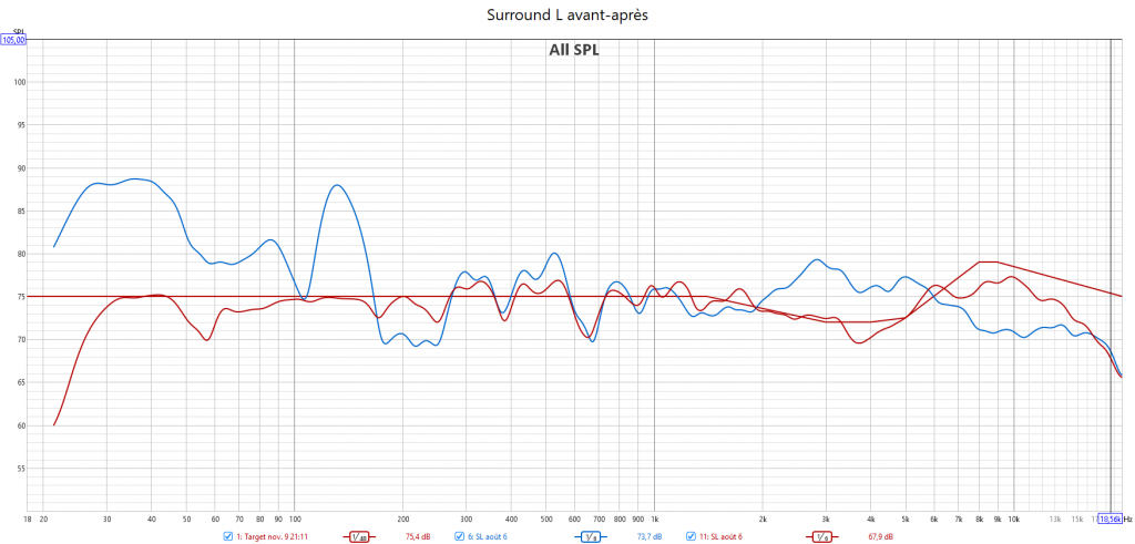 Pour la surround gauche, on comprend mieux pourquoi elle m’avait sifflé à l’oreille aux tests d’avant calibrage : le niveau élevé de l’aigu en plein dans la zone sensible de l’oreille (2-5kHz). Ce qu’on appelle de l’agressivité. Après calibrage, plus d’agressivité.