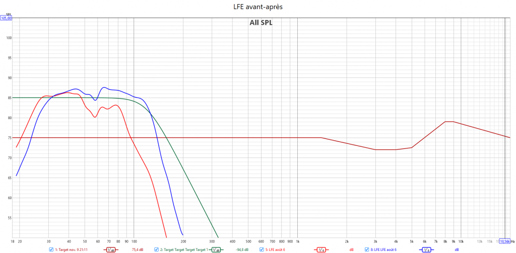 Pour le LFE, je n’ai pas cherché à récupérer la réponse sous 30 Hz. Avec une écoute à -10dB, les caissons sont déjà très sollicités pour leur capacité.
