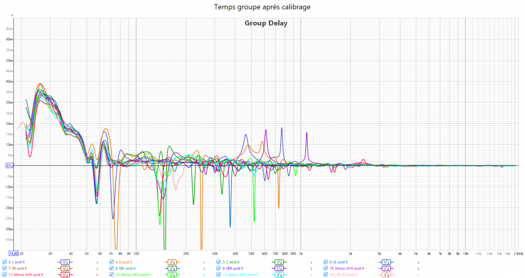 Après calibrage, la nouvelle réponse des caissons est placée à un niveau sonore cohérent pour un rendu équilibré. Toutes les enceintes sont en « Petite ». Celles au sol sont coupées à 80Hz, les atmos à 150Hz. Le temps groupe devient bien meilleur dans le grave après avoir également compensé le retard du LFE. La bande passante réduite dans le grave des atmos ne permet pas un bon raccord avec le LFE. D’où les creux vers les 145 Hz. Ce n’est pas un problème de phase. Attention aux mauvaises interprétations. C’est d’ailleurs pour cela que beaucoup de pro ne publient aucune mesure : pour éviter les interprétations malveillantes et autres propos calomnieux.