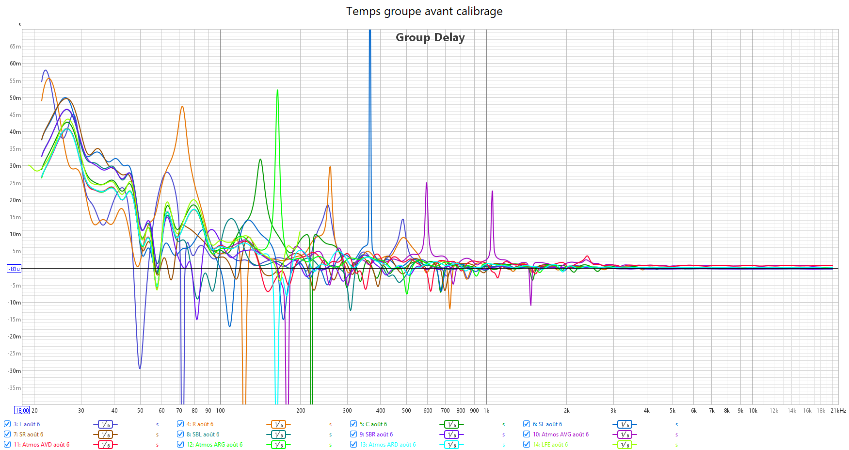 Avant calibrage, Audyssey a mis les colonnes en « Grande », ce qui n’est pas forcément judicieux puisqu’on voit bien sur les courbes de temps groupe qu’elles ne sont pas synchro avec les caissons. Ce sont les 2 courbes qui montent à presque 60ms de retard.