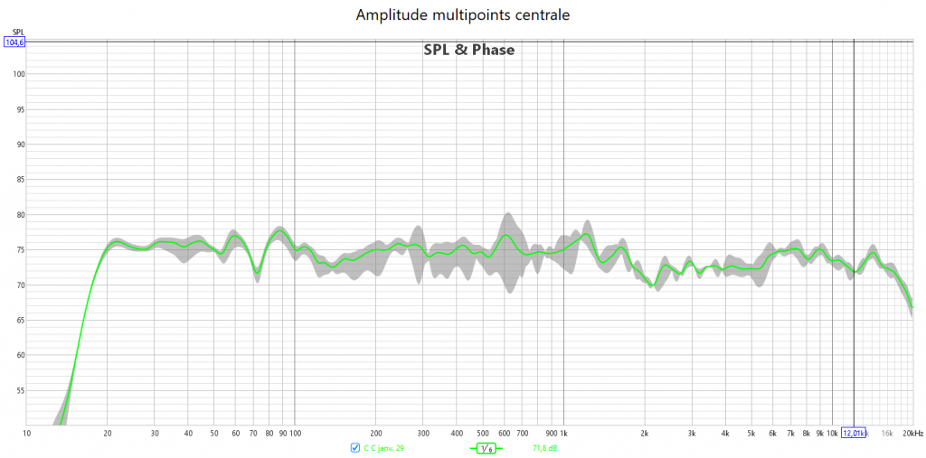 Ci-dessous la correction en amplitude avec Audyssey des frontales droite et gauche, la centrale , la surround droite, la surround arrière droite et le LFE. La mesure multipoints de la centrale montre la variation de la réponse sur une zone au point d’écoute de seulement 36cm de large. On note l’amélioration de la réponse impulsionnelle du LFE grave à mon calage manuelle. Mais cela reste perfectible. Il faudrait pour cela utiliser un DSP externe pour optimiser les 2 caissons.