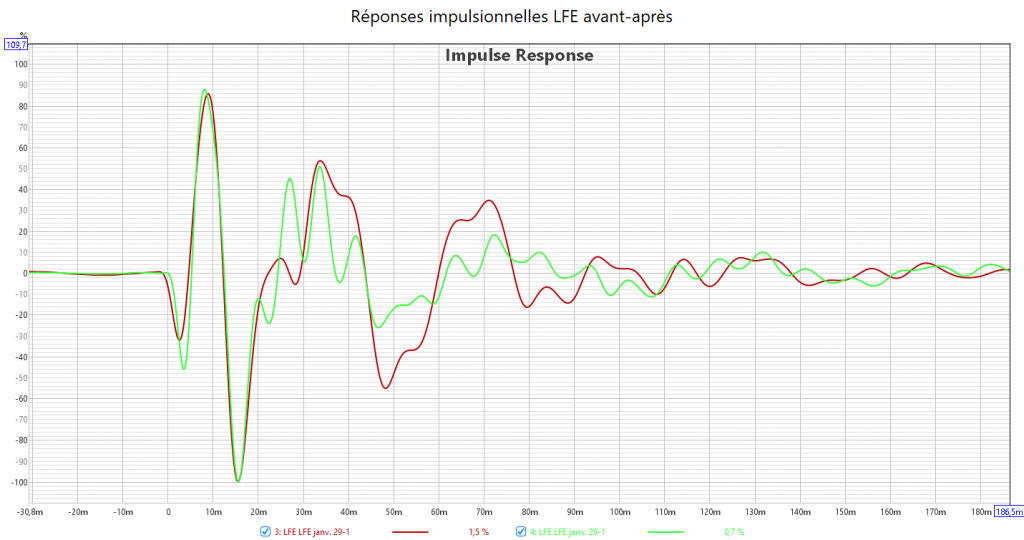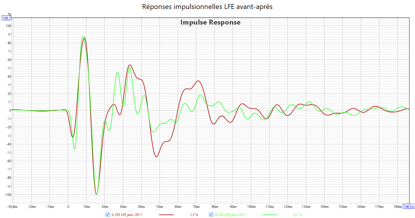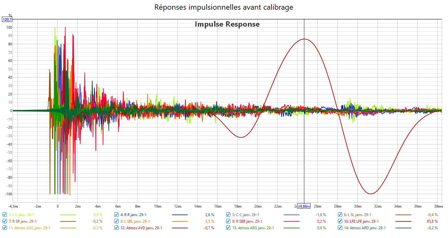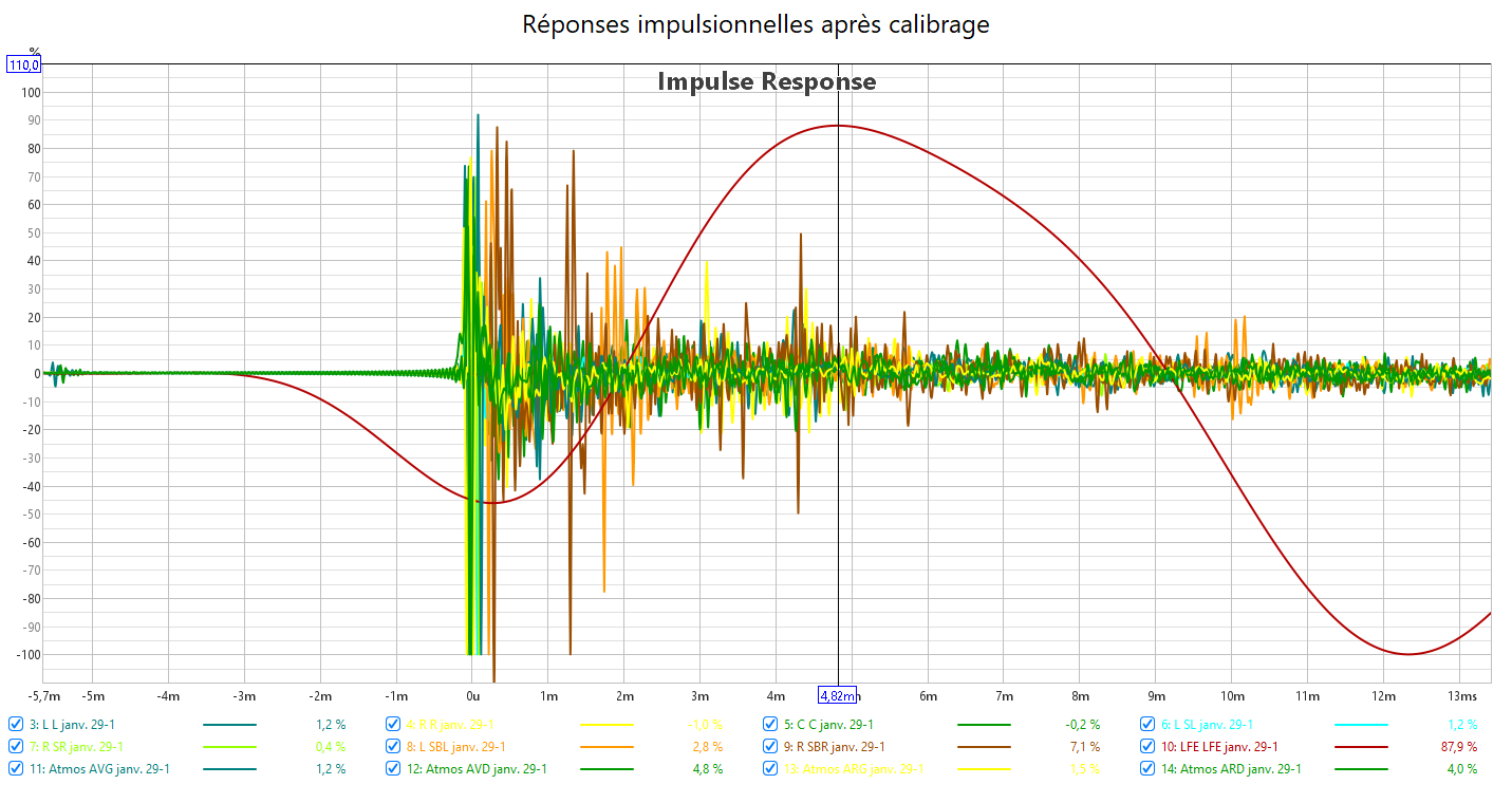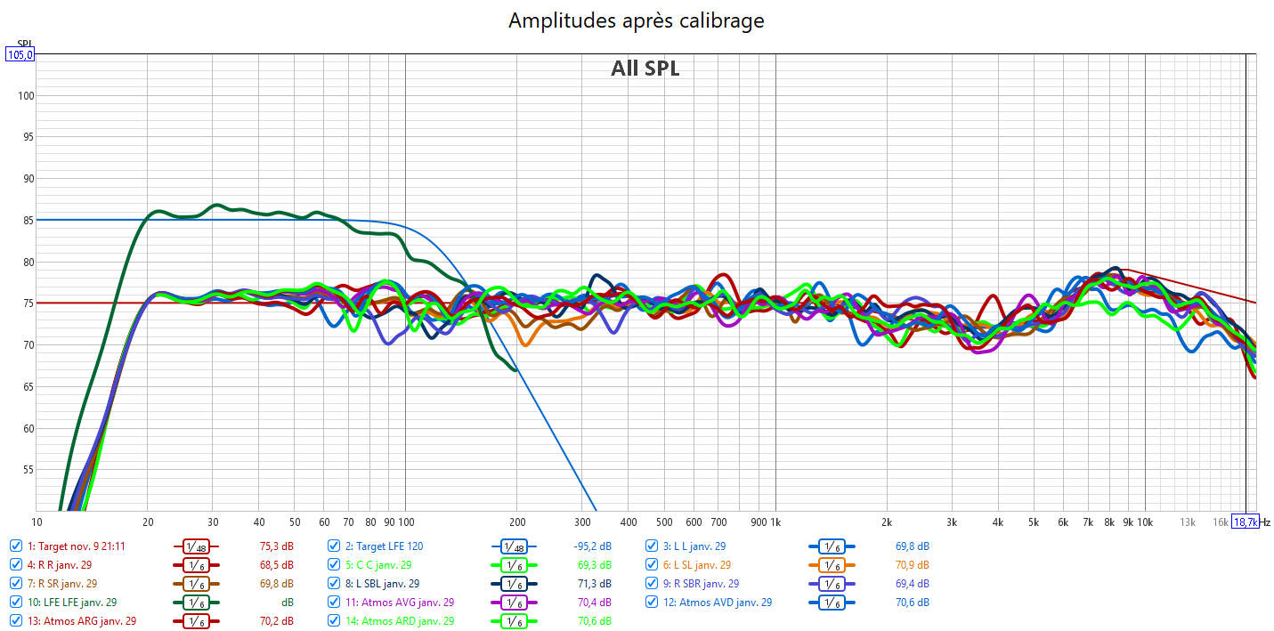 Après calibrage, toutes les enceintes en petite et le retard du LFE compensé au maximum possible, les mesures sont bien meilleures qu’avant.