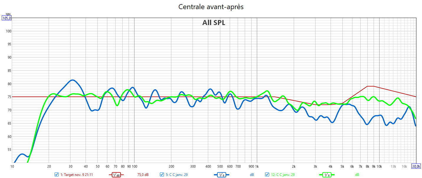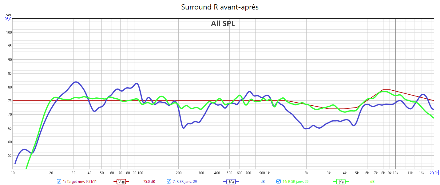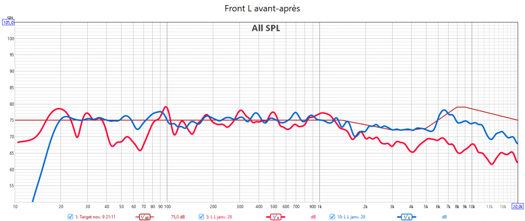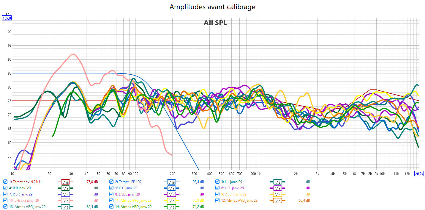 Après calibrage, les mesures n’ont plus rien à voir. 𝗜𝗹 𝗻’𝘆 𝗮 𝗽𝗹𝘂𝘀 𝗱𝗲 𝗰𝗵𝘂𝘁𝗲 𝗱𝗲𝘀 𝗿𝗲́𝗽𝗼𝗻𝘀𝗲𝘀 𝗮𝘂-𝗱𝗲𝘀𝘀𝘂𝘀 𝗱𝗲𝘀 𝟭𝗸𝗛𝘇. Toutes les réponses sont alignées avec la nouvelle courbe cible qui prend en compte la sensibilité de l’oreille. J’ai donc corrigé la réponse des enceintes pour harmoniser la bulle sonore et prendre en compte la configuration de la pièce avec les enceintes encastrées. 𝗖𝗲𝗰𝗶 𝗲𝗻 𝗮𝗱𝗲́𝗾𝘂𝗮𝘁𝗶𝗼𝗻 𝗮𝘃𝗲𝗰 𝗹𝗲 𝗻𝗶𝘃𝗲𝗮𝘂 𝗱’𝗲́𝗰𝗼𝘂𝘁𝗲 𝗾𝘂𝗶 𝘁𝗼𝘂𝗿𝗻𝗲 𝗮𝘂𝘁𝗼𝘂𝗿 𝗱𝗲𝘀 -𝟮𝟬𝗱𝗕. L’alignement des niveaux sonores de toutes les enceintes assure l‘équilibre de cette bulle sonore. La réponse dans le grave est nettement plus linéaire avec aussi une meilleure réponse impulsionnelle. Le nœud acoustique à 40Hz du caisson avant est compensé par le caisson arrière. J’ai aligné temporellement les 2 caissons. Pour cela l’utilisation d’un Y pour utiliser une seule sortie Sub de l’ampli est obligatoire pour s’affranchir des calage hasardeux d’Audyssey. Le temporel se gère manuellement avec la phase des caissons.