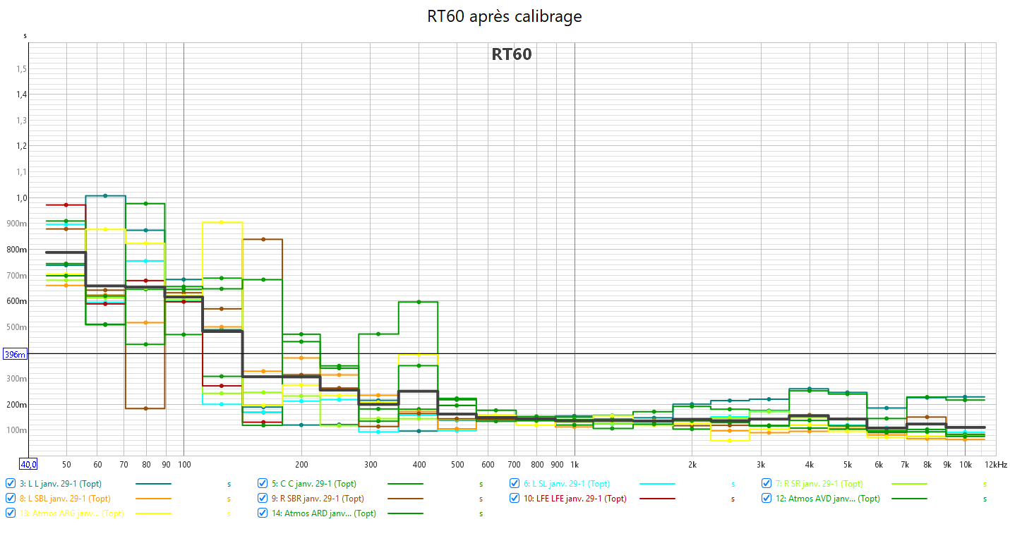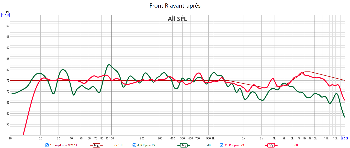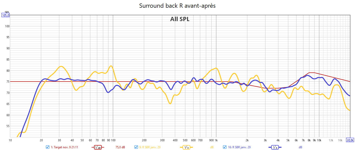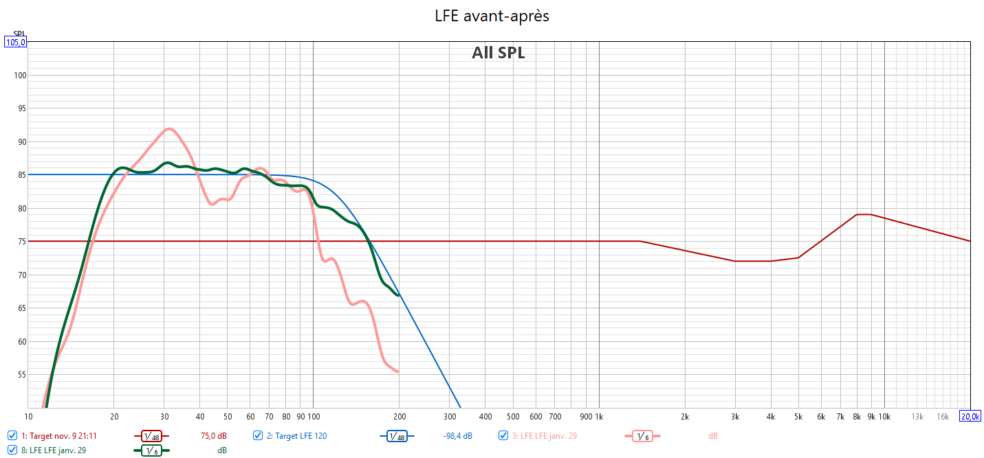Après calibrage, les mesures n’ont plus rien à voir. 𝗜𝗹 𝗻’𝘆 𝗮 𝗽𝗹𝘂𝘀 𝗱𝗲 𝗰𝗵𝘂𝘁𝗲 𝗱𝗲𝘀 𝗿𝗲́𝗽𝗼𝗻𝘀𝗲𝘀 𝗮𝘂-𝗱𝗲𝘀𝘀𝘂𝘀 𝗱𝗲𝘀 𝟭𝗸𝗛𝘇. Toutes les réponses sont alignées avec la nouvelle courbe cible qui prend en compte la sensibilité de l’oreille. J’ai donc corrigé la réponse des enceintes pour harmoniser la bulle sonore et prendre en compte la configuration de la pièce avec les enceintes encastrées. 𝗖𝗲𝗰𝗶 𝗲𝗻 𝗮𝗱𝗲́𝗾𝘂𝗮𝘁𝗶𝗼𝗻 𝗮𝘃𝗲𝗰 𝗹𝗲 𝗻𝗶𝘃𝗲𝗮𝘂 𝗱’𝗲́𝗰𝗼𝘂𝘁𝗲 𝗾𝘂𝗶 𝘁𝗼𝘂𝗿𝗻𝗲 𝗮𝘂𝘁𝗼𝘂𝗿 𝗱𝗲𝘀 -𝟮𝟬𝗱𝗕. L’alignement des niveaux sonores de toutes les enceintes assure l‘équilibre de cette bulle sonore. La réponse dans le grave est nettement plus linéaire avec aussi une meilleure réponse impulsionnelle. Le nœud acoustique à 40Hz du caisson avant est compensé par le caisson arrière. J’ai aligné temporellement les 2 caissons. Pour cela l’utilisation d’un Y pour utiliser une seule sortie Sub de l’ampli est obligatoire pour s’affranchir des calage hasardeux d’Audyssey. Le temporel se gère manuellement avec la phase des caissons.