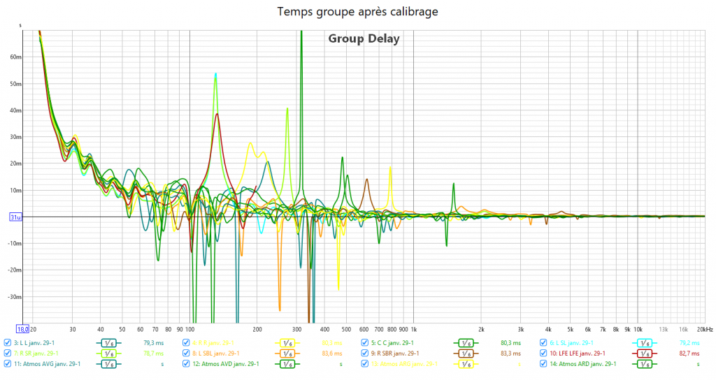 Après calibrage, j’ai pu compensé le retard du LFE de presque 20ms tout en obtenant une bonne phase aux crossover. Les courbes de temps groupe sont bien plus propres. L’alignement temporel des enceintes est maintenant très bon, dans une fourchette inférieure à 0,5 milliseconde.