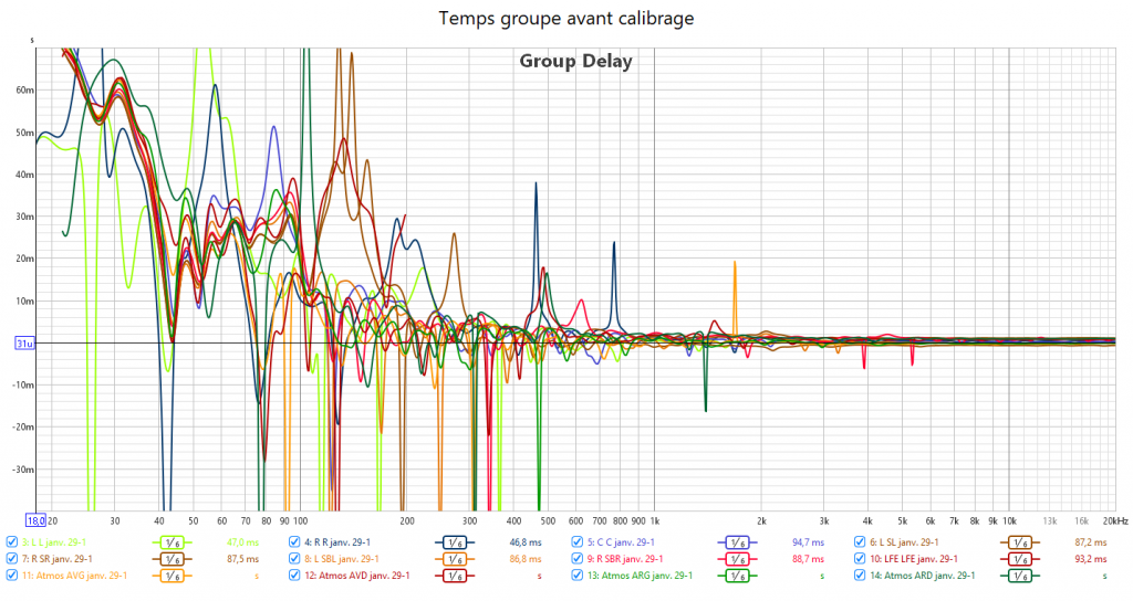 Avant calibrage, on constate bien le retard important du LFE sur les courbes de temps groupe. On voit aussi le non alignement temporel entre le grave des frontales et celui du LFE.