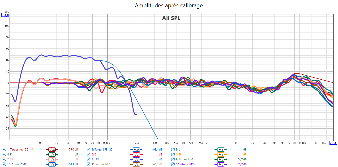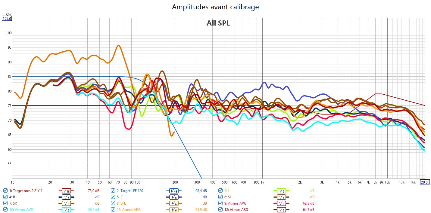 Avant calibrage, les mesures en amplitudes montrent beaucoup de disparités dans les réponses, surtout en niveau sonore au-dessus de 500Hz. 𝗟𝗮 𝗰𝗲𝗻𝘁𝗿𝗮𝗹𝗲 𝗲𝘀𝘁 𝗹𝗮 𝗽𝗹𝘂𝘀 𝗳𝗼𝗿𝘁𝗲, 𝗺𝗶𝘀𝗲 𝗲𝗻 𝗮𝘃𝗮𝗻𝘁 𝗮𝘃𝗲𝗰 𝗹𝗮 𝗳𝗼𝗻𝗰𝘁𝗶𝗼𝗻 « 𝗮𝗺𝗲́𝗹𝗶𝗼𝗿𝗮𝘁𝗶𝗼𝗻 𝗱𝗲𝘀 𝗱𝗶𝗮𝗹𝗼𝗴𝘂𝗲𝘀 » 𝗾𝘂𝗲 𝗷𝗲 𝗱𝗲́𝗰𝗼𝗻𝘀𝗲𝗶𝗹𝗹𝗲 𝗳𝗼𝗿𝘁𝗲𝗺𝗲𝗻𝘁. Cela déséquilibre complètement la bulle sonore. Les 2 frontales sont en retrait et encore plus les atmos avant. La scène frontale chute progressivement après 2 kHz. Si cela assure l’absence d’agressivité, il y a une perte importante d’informations audibles par le manque d’aigus et d’extrêmes aigus et donc un manque de clarté. Certaines fréquences dans le haut grave et bas médium sont bien trop présentes déformant le rendu sonore comme celui des voix. La réponse du LFE manque de linéarité et n’est pas correctement aligné aux crossover avec les enceintes. Cela crée des creux dans les réponses.