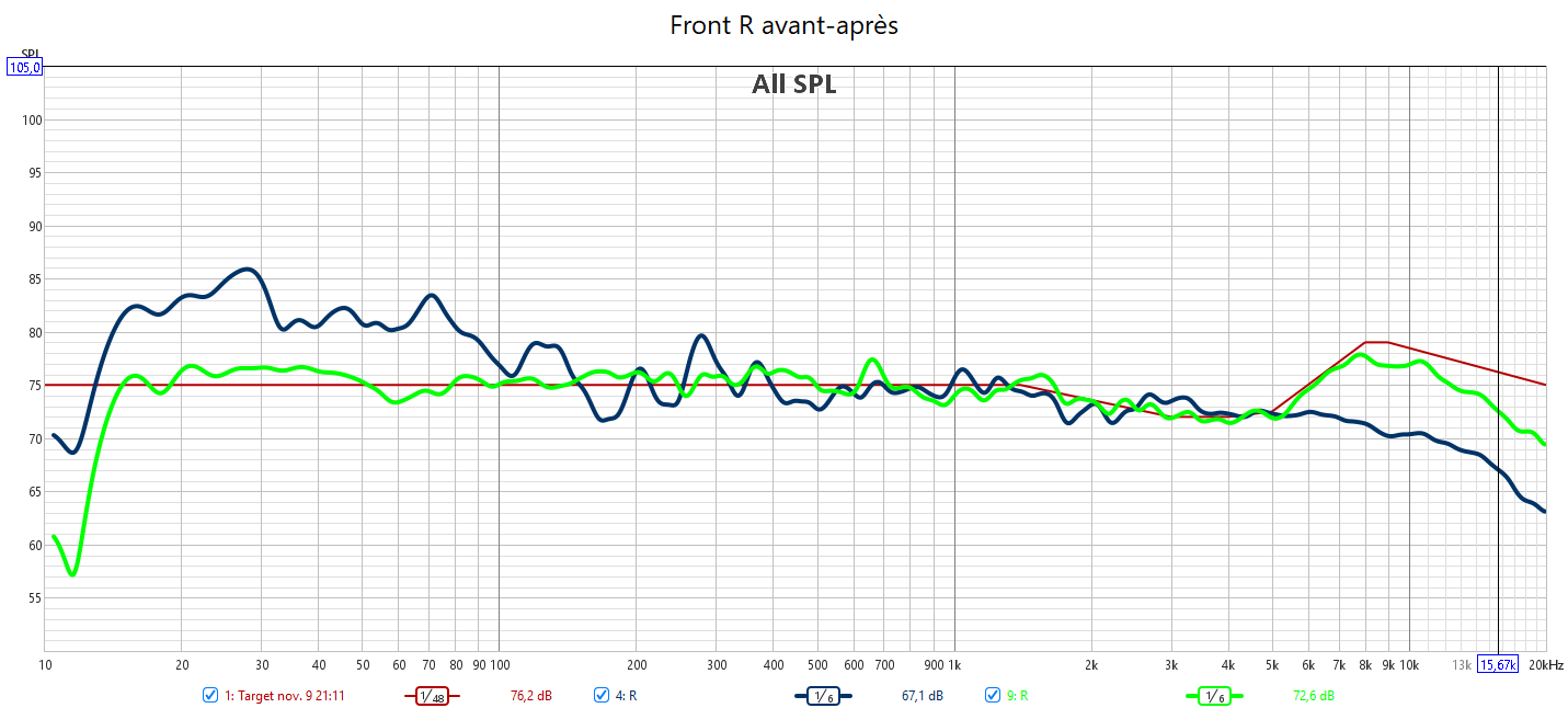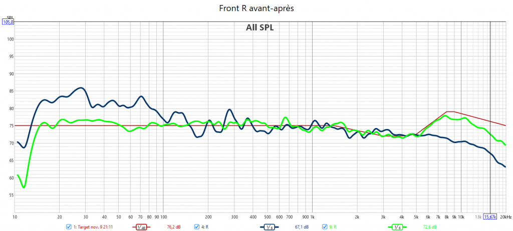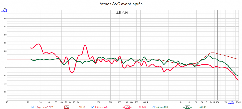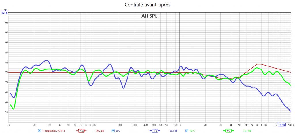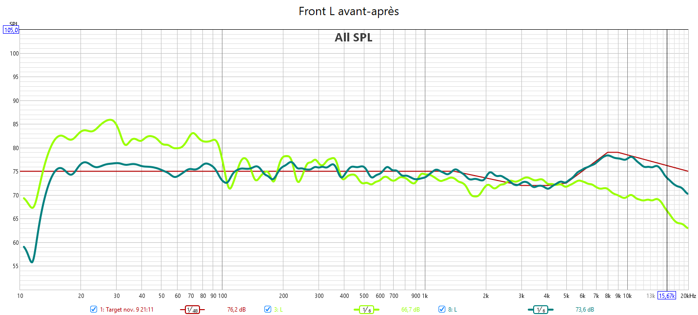 Après calibarge, le bon alignement en niveau sonore et en réponse assure l’équilibre de la bulle sonore. Toutes les enceintes suivent la nouvelle courbe cible qui prend en compte la sensibilité de l’oreille. Cela garantit un rendu sonore claire, détaillé et non agressif. Les voix sont bien intelligibles. Plus besoin de modifier le niveau de la centrale. La réponse du LFE est bien plus linéaire et propre qu’avant avec une meilleure réponse impulsionnelle. Les crossover sont optimisés grâce à un bien meilleur alignement temporel.
