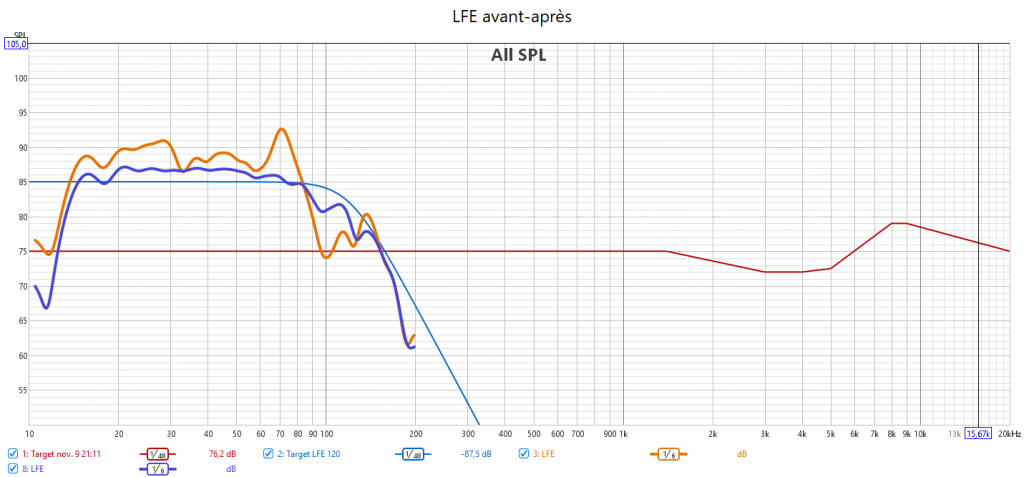 Après calibrage, J’ai compensé le retard du LFE pour de meilleurs crossover pour obtenir un bien meilleur crossover, sans décalage temporel. Le grave se comporte beaucoup mieux.