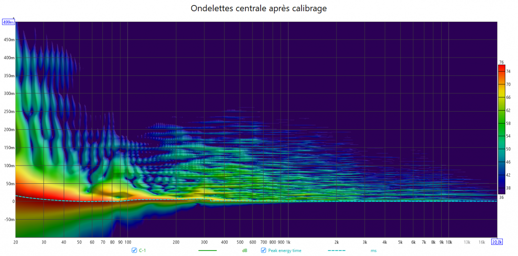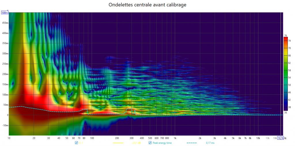 Ondelettes de la centrale avant calibrage. On constate bien le retard du LFE avec des trainages important dans le grave.