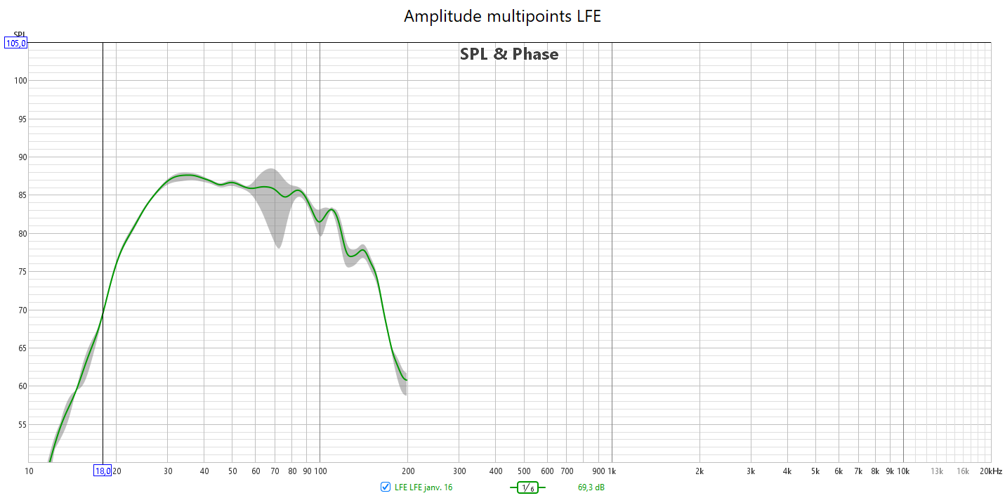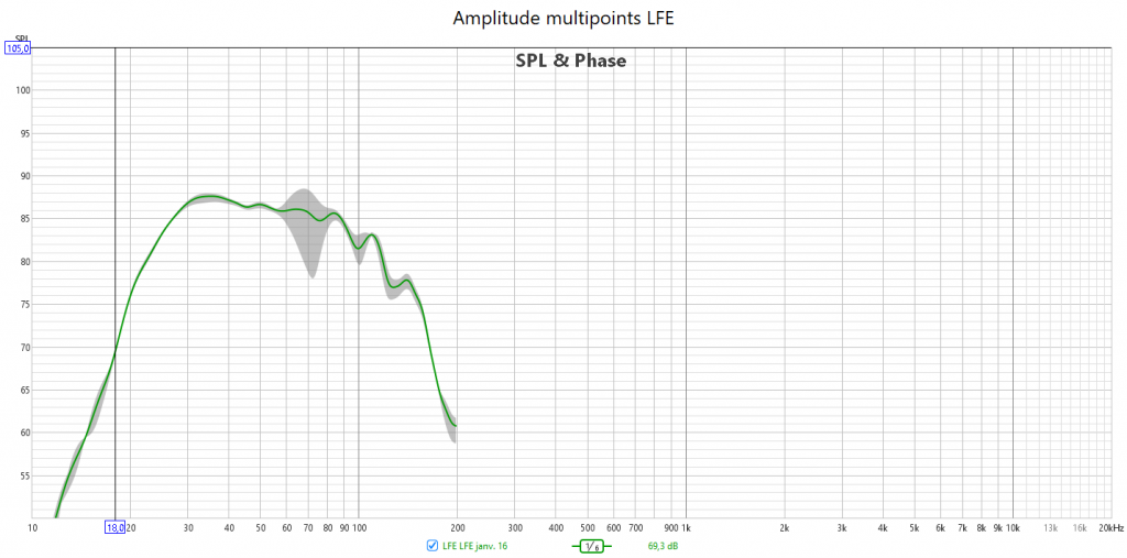 Ci-dessous la correction en amplitude avec Audyssey du LFE, de la frontale gauche, la centrale et des surround droite et gauche. La mesure en multipoints du LFE montre la variation de la réponse sur une zone au point d’écoute de seulement 36cm de large.