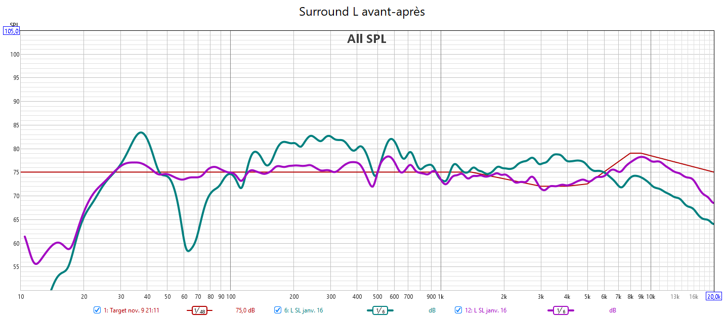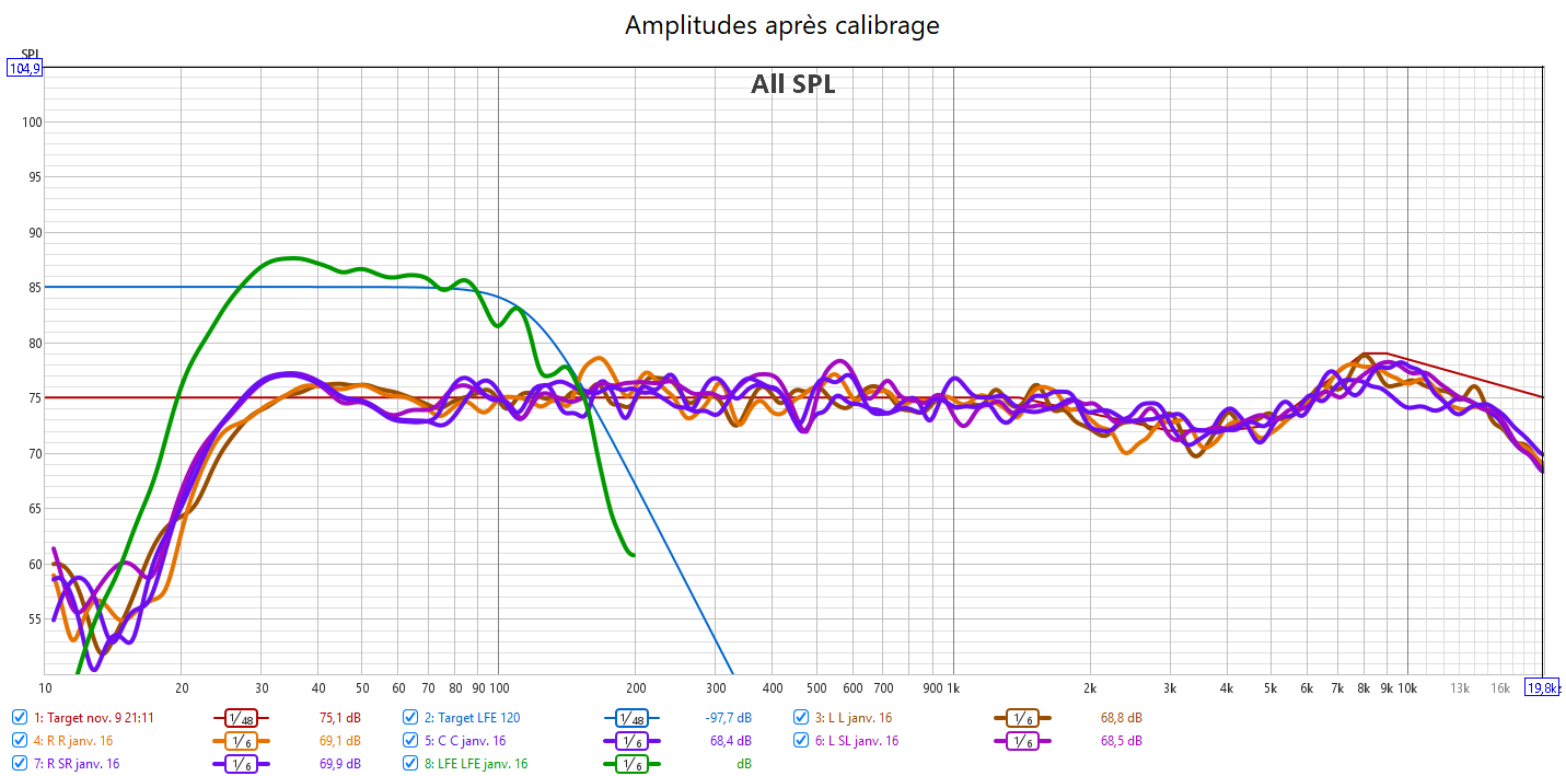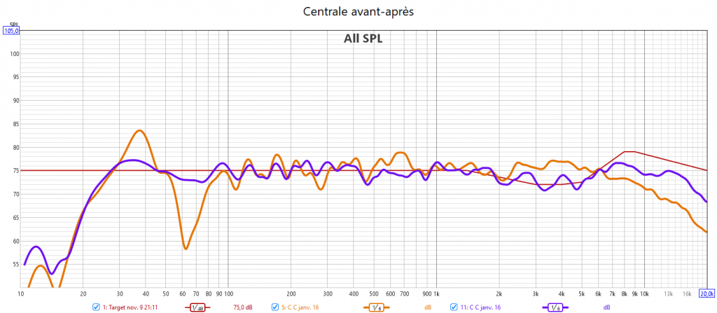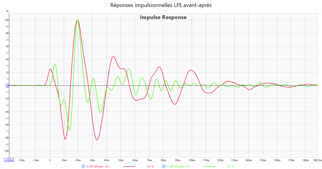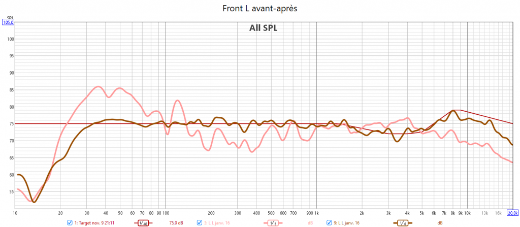 Après calibrage, j’obtiens un gros changement concernant l’équilibre de la bulle sonore : tous les niveaux sont alignés et toutes les réponses suivent la nouvelle courbe cible prenant en compte la sensibilité de l’oreille. Gain en clarté sans agressivité et plus de problèmes dans le bas médium. Les colonnes fonctionnant bien dans le grave, quasiment aussi bas que le caisson, j’ai laissé les colonnes en « grande » pour soulager le caisson clos qui est bien moins à l’aise que les caissons bass-reflex dans les fréquences très basses. J’en parle ici. J’ai donc dû mettre en phase le caisson avec les colonnes tout en ayant de bons crossover avec la centrale et les surround. Je n’avais pas la bonne polarité sur les surround que j’ai donc inversé. La réponse du LFE est nettement meilleure après avoir bien configuré le caisson avant de relancer le calibrage Audyssey. La réponse impulsionnelle est aussi bien améliorée.