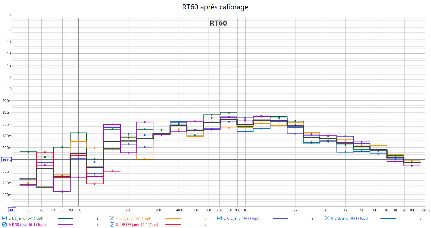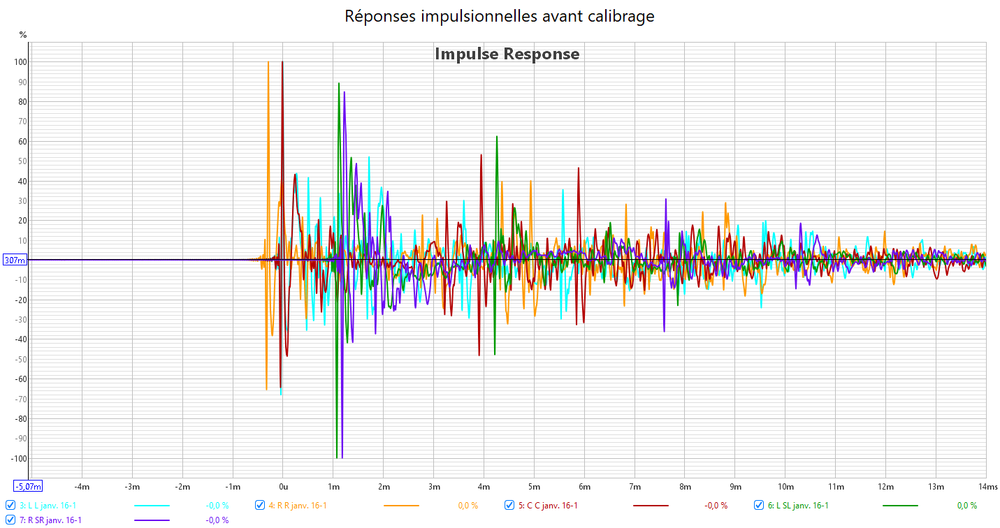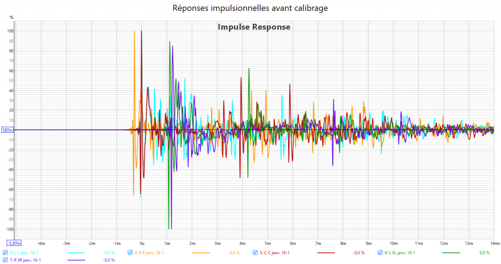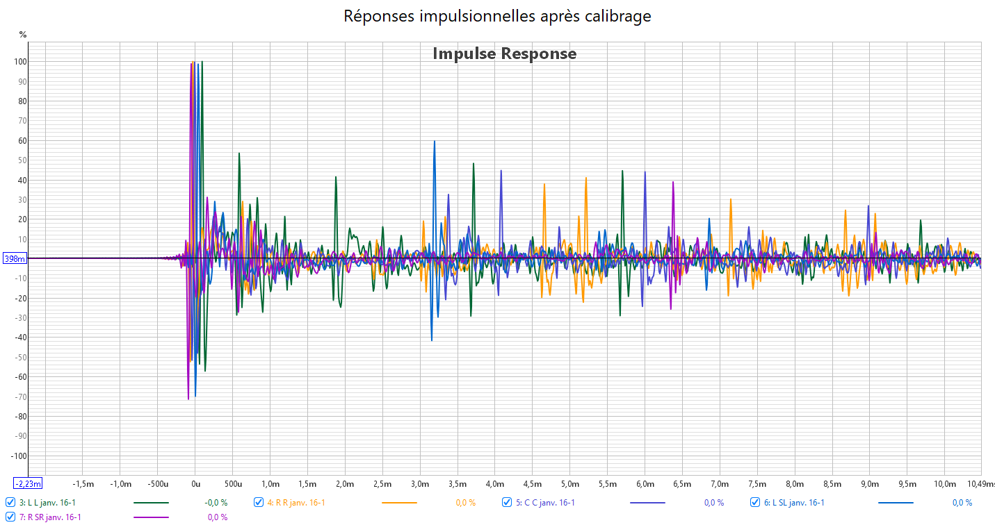 Après calibrage, j’obtiens un gros changement concernant l’équilibre de la bulle sonore : tous les niveaux sont alignés et toutes les réponses suivent la nouvelle courbe cible prenant en compte la sensibilité de l’oreille. Gain en clarté sans agressivité et plus de problèmes dans le bas médium. Les colonnes fonctionnant bien dans le grave, quasiment aussi bas que le caisson, j’ai laissé les colonnes en « grande » pour soulager le caisson clos qui est bien moins à l’aise que les caissons bass-reflex dans les fréquences très basses. J’en parle ici. J’ai donc dû mettre en phase le caisson avec les colonnes tout en ayant de bons crossover avec la centrale et les surround. Je n’avais pas la bonne polarité sur les surround que j’ai donc inversé. La réponse du LFE est nettement meilleure après avoir bien configuré le caisson avant de relancer le calibrage Audyssey. La réponse impulsionnelle est aussi bien améliorée.