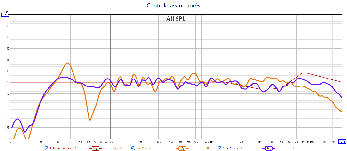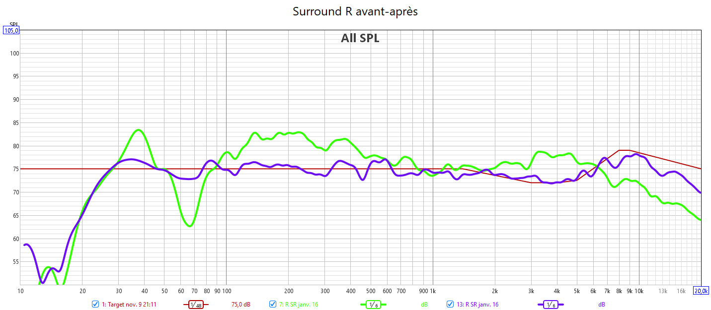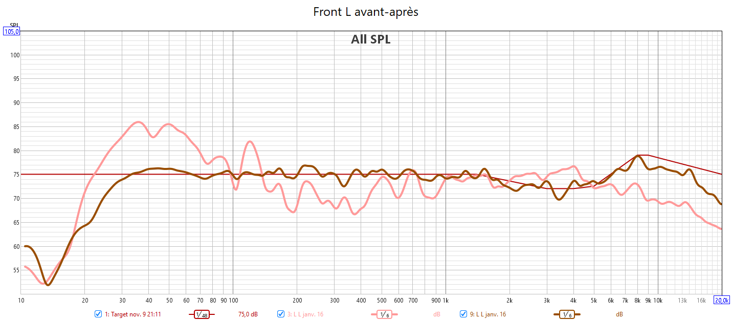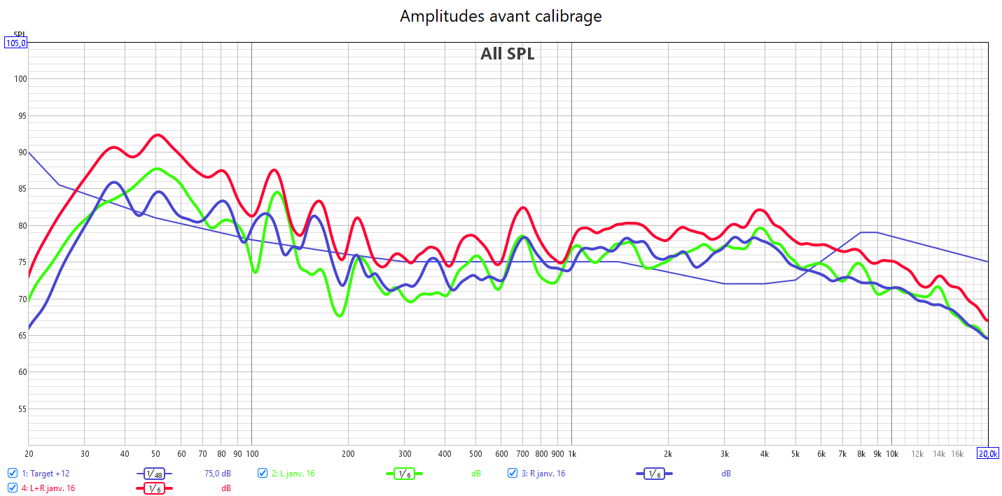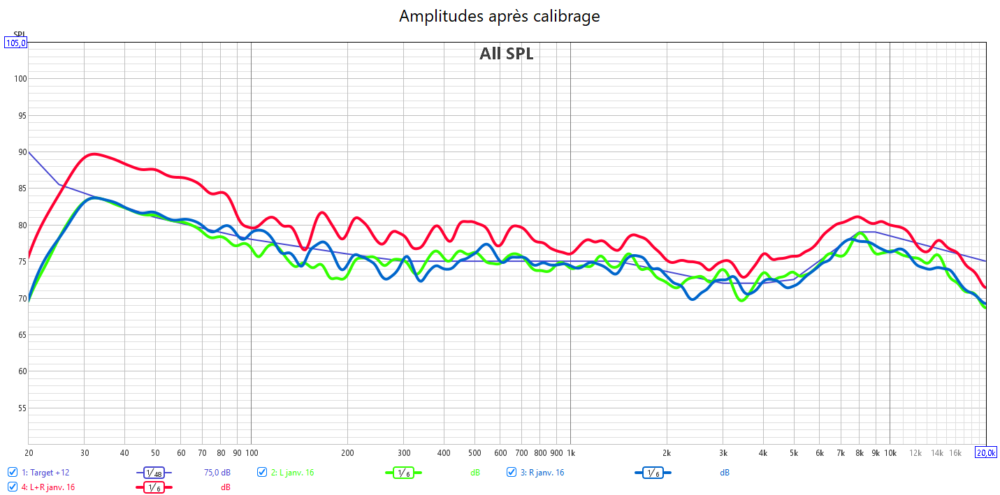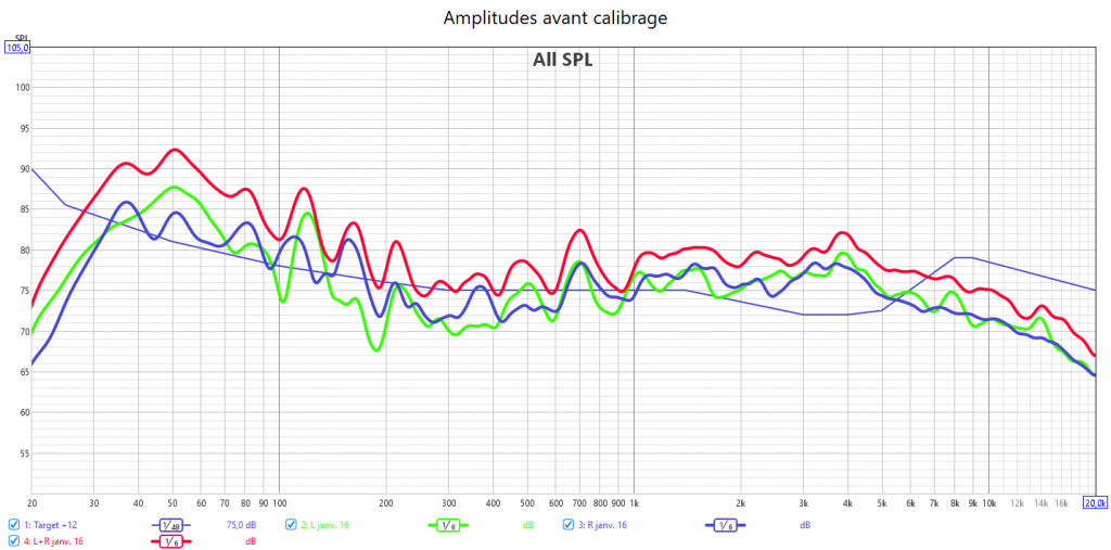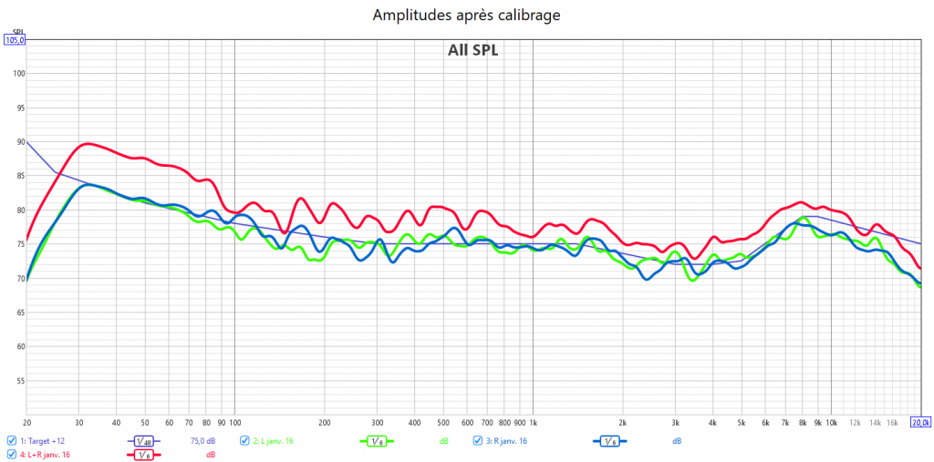 Après calibrage 2.1 : j’ai conservé les colonnes en « grande » avec une correction plate dans le grave, comme pour le home cinéma. Généreuses dans le grave, je les ai donc calmées. Ce qui soulage l’ampli et apporte suffisamment de graves pour soulager le caisson. La courbe cible est différente du home cinéma et doit remonter dans le grave. Ce que permet le caisson que j’ai réajusté temporellement pour coller aux colonnes, du moins pour la phase. Car on est toujours limité par les 6m du Denon. Les colonnes bénéficient de la correction pour le manque de bas médium et du manque d’extrêmes aigus tout en baissant l’aigu pour ne pas avoir d’agressivité. Le respect de la courbe cible rééquilibre le rendu sonore des Monitor audio.