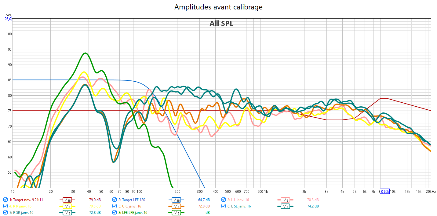 Avant calibrage, il n’y a pas de correctif Audyssey. On a principalement un gros déséquilibre dans le bas médium qui met en avant les surround. C’était mon premier ressenti à l’écoute ce qui déséquilibre la bulle sonore. Attention à l’agressivité de la scène frontale liée aux hauts niveaux de l’aigu entre 2 et 5kHz. Ce sera plus flagrant pour par la parte HiFi. Après 6kHz, toutes les réponses chutent tronquant la bande passante audible. D’où le manque de précision dans le rendu sonore. La réponse du caisson n’a pas le bon profil ni la bonne bande passante en mettant en avant une fine plage de fréquence entre 30 et 60Hz. Le LFE doit couvrir les fréquences jusqu’à 120Hz. Les colonnes sont en « grande » et descendent assez bas en fréquence avec trop de graves. Le creux entre entre 50 et 80Hz indique que le caisson n’est pas en phase avec la centrale et les surround. Aussi qu’il y a un problème sur les fréquences de crossover utilisées.