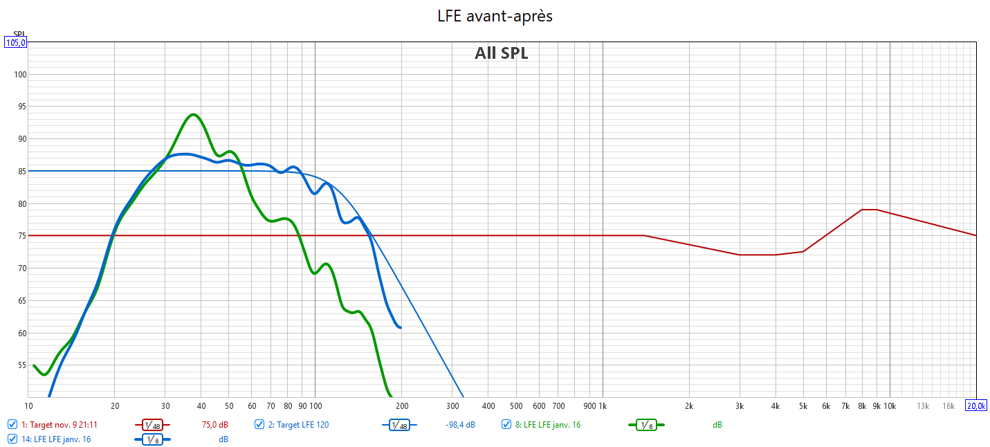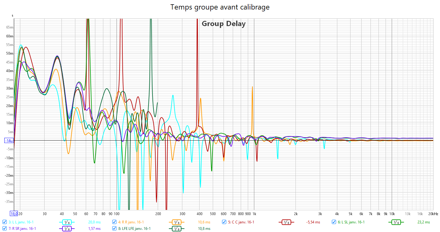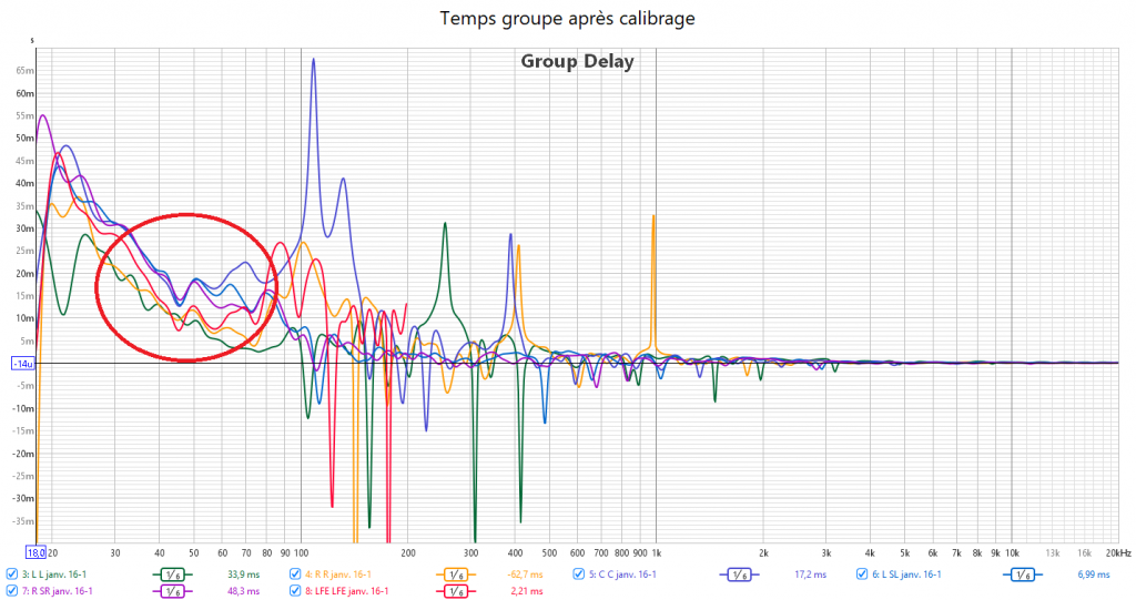Avant calibrage, le profil des courbes dans le grave n’est pas bon, avec trop de retard du LFE.