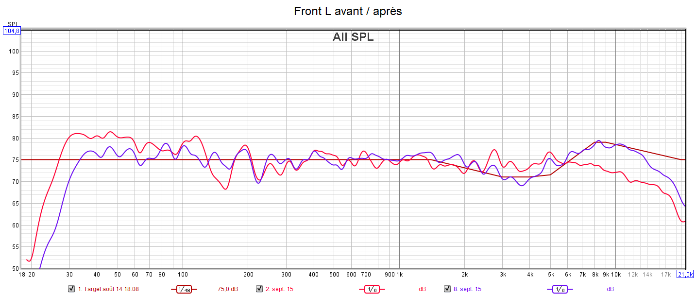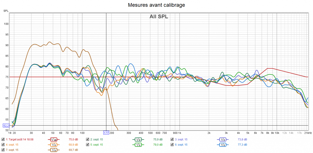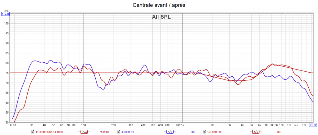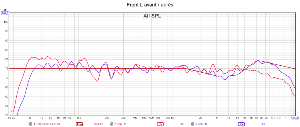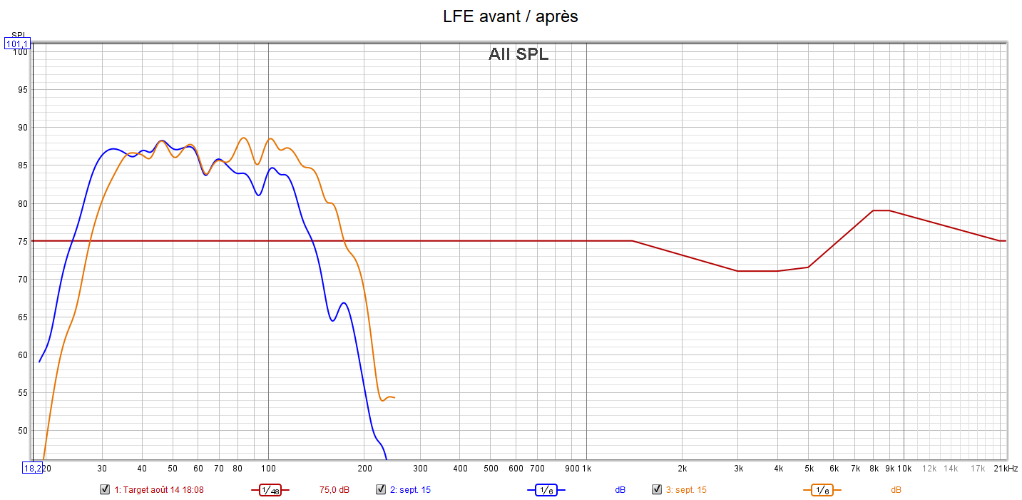 Je pars d’un ampli Denon complètement neuf qui remplace avantageusement un Onkyo TX-NR646. J’ai donc pris les mesures après avoir effectué le calibrage automatique Audyssey. On est après le calibrage Audyssey, mais avant mon calibrage. Et je constate suite aux mesures qu’Audyssey a mis trop de niveau pour le LFE (+15 dB). Celui des enceintes est plutôt bon. On peut voir que la zone 100 – 300 Hz est mal gérée (fluctuation des courbes). On est dans la zone des crossover (recouvrement entre le son du caisson et celui des enceintes). La réponse des enceintes suit la courbe cible d’Audyssey qui se caractérise par une courbe plate puis une chute dans les aigus, ce qui crée un manque de clarté et de détails à l’écoute. Mon calibrage prend en compte la sensibilité de l’oreille selon les courbes isosoniques de Flutcher et Munson. Une courbe cible en est extrapolée pour remplacer celle d’Audyssey.