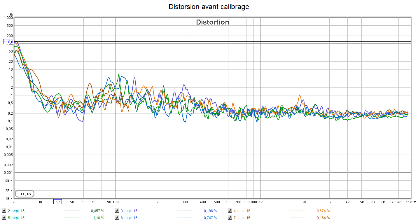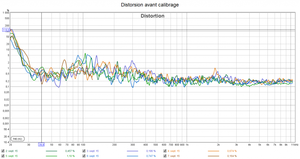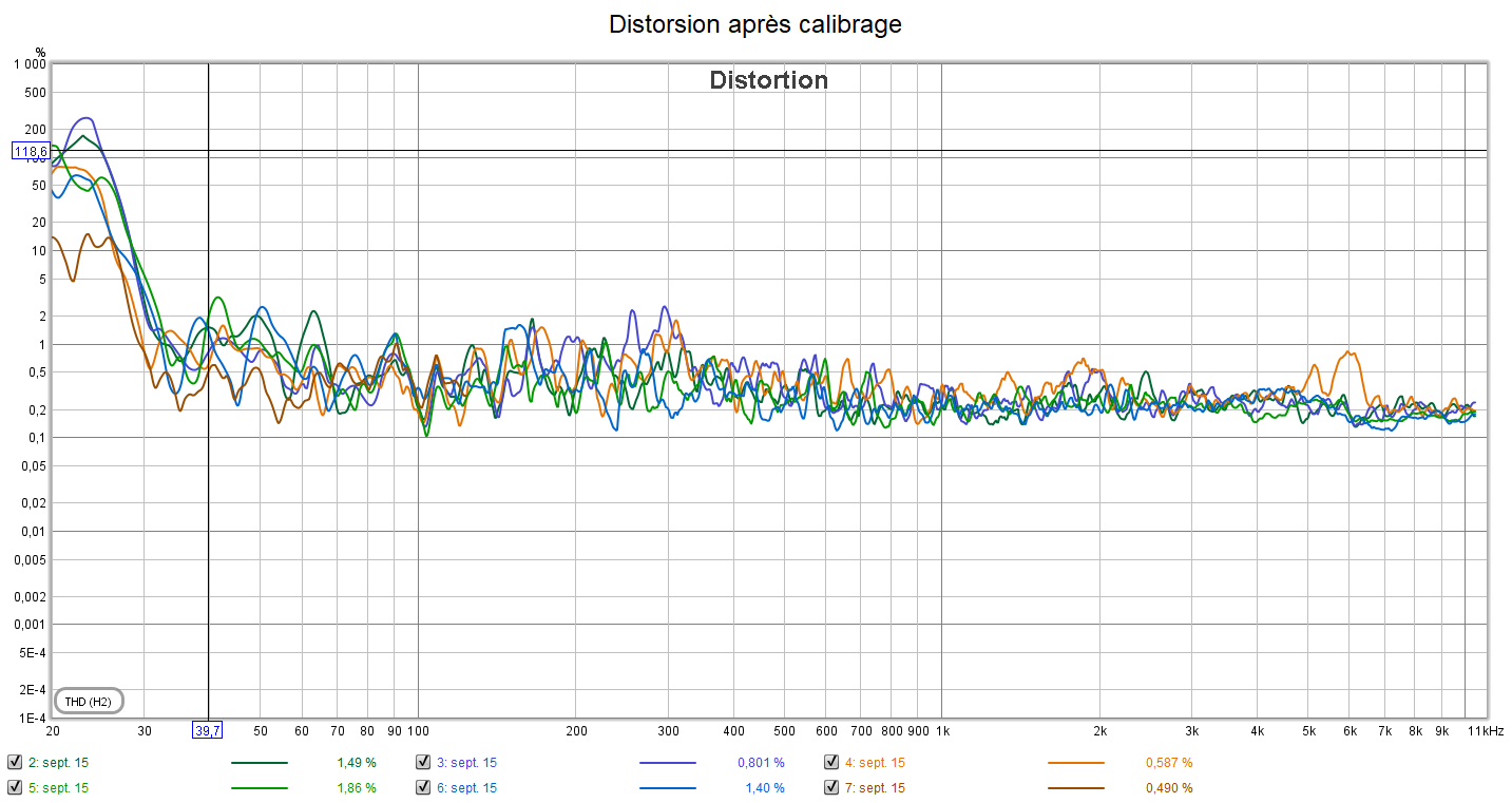 Comme dit avant, les crossover ont été optimisés ce qui se traduit par plus de stabilité dans les réponses entre 100 et 300 Hz après calibrage. On note bien ce gain dans la distorsion qui baisse dans cette zone après calibrage pour avoir quelque chose de beaucoup mieux. La distorsion augmente sous les 30 Hz car le caisson ne sait pas reproduire ces fréquences.
