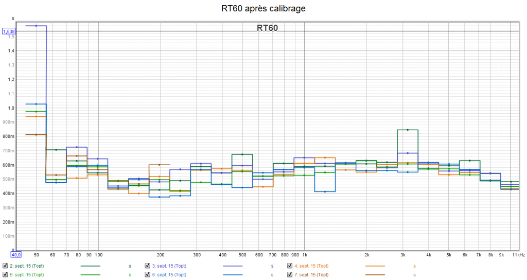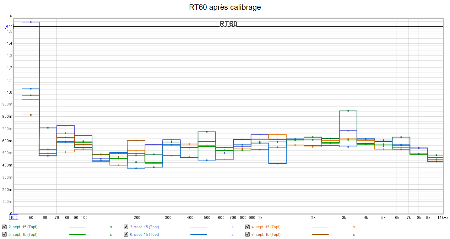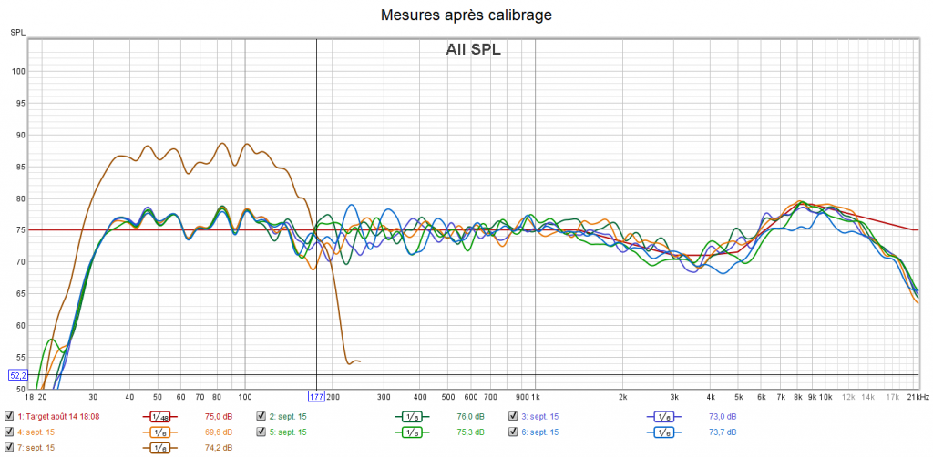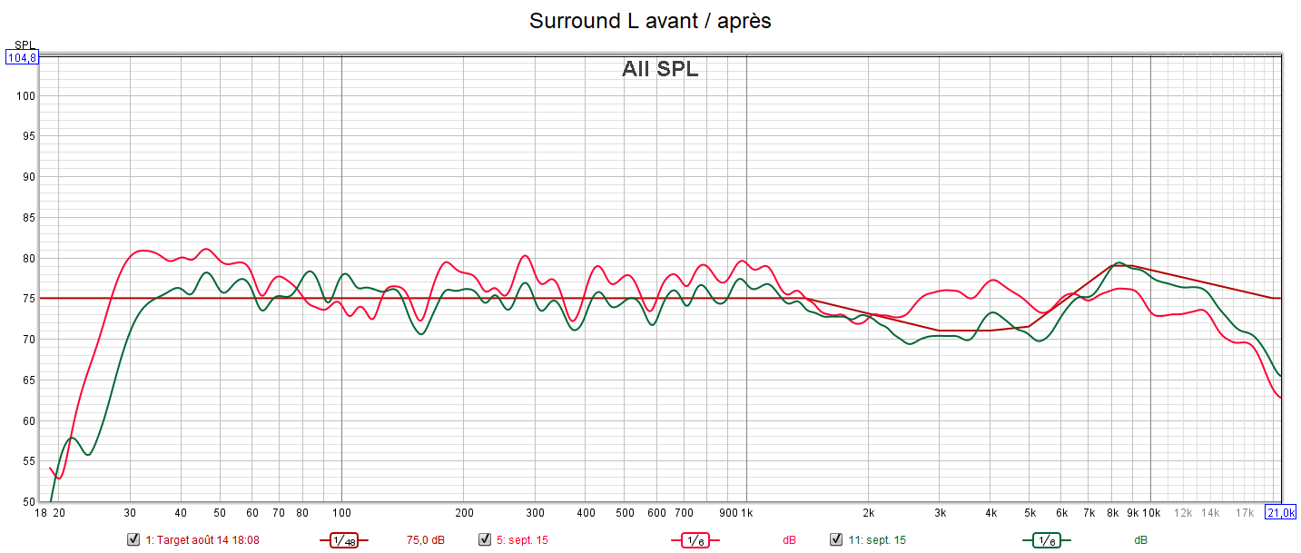 Le calibrage débute par le déplacement du caisson pour améliorer sa réponse au-dessus des 60 Hz. Après calibrage, toutes les réponses des enceintes suivent la nouvelle courbe cible avec des niveaux très bien ajustés. Les surrounds droite et gauche ont un niveau dans les aigus légèrement plus faible pour prendre en compte leur proximité avec les places 2 et 3 sur le canapé. Le caisson est remis à un niveau qui permet d’avoir de la cohérence avec les enceintes (environ +10 dB par rapport aux enceintes). Les crossover ont été optimisés ce qui se traduit par plus de stabilité dans les réponses entre 100 et 300 Hz.