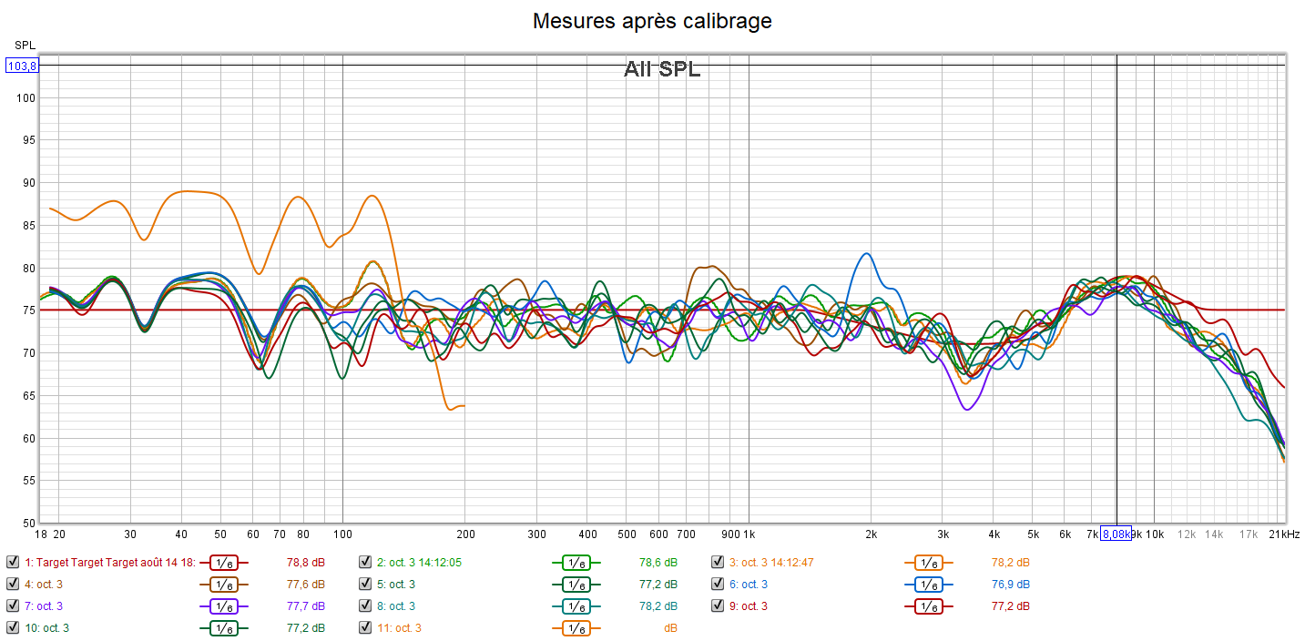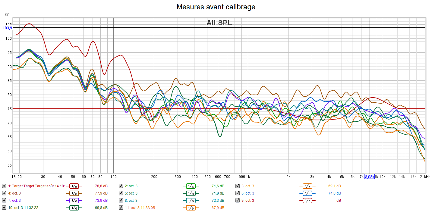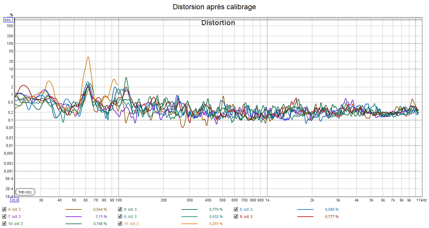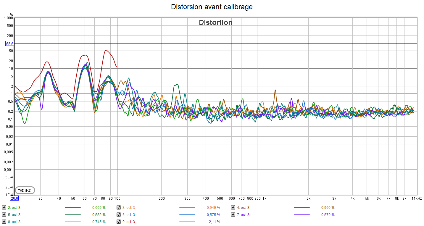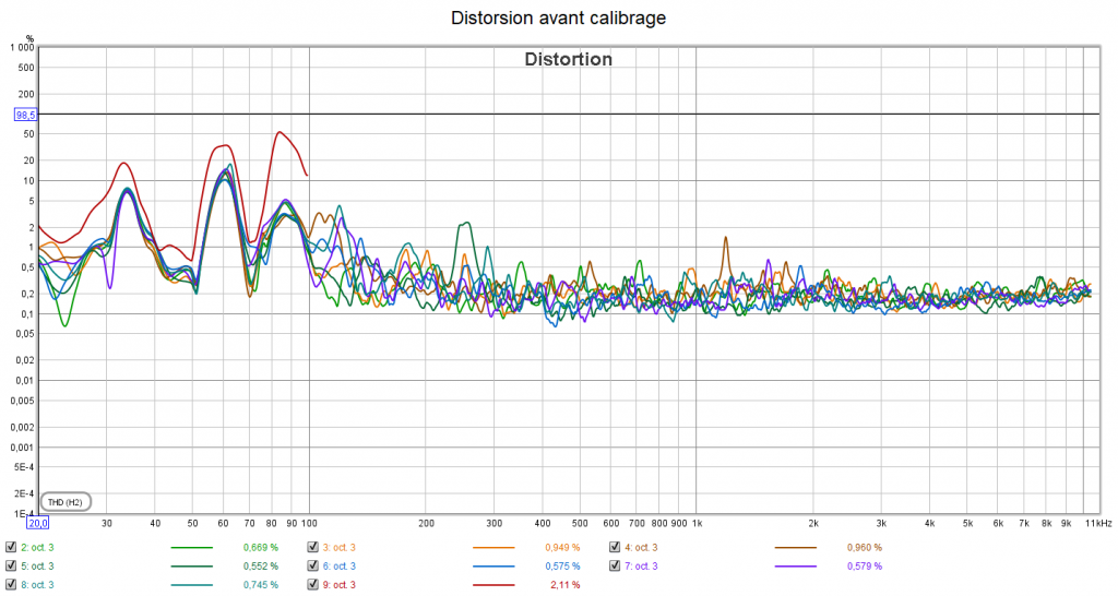 Avant calibrage, les caissons ne sont pas en phase et la réponse dans le grave n’est pas optimisée. Tout cela se constate sur les relevés de distorsion.