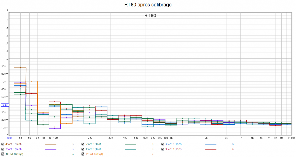 Le RT60 (réverbération de la pièce) est en grande partie à 200 ms et remonte vers les 400 ms dans le haut grave. Ce qui est bon dans l’ensemble. La recommandation étant de ne pas dépasser les 400 ms. La bonne acoustique est également à l’origine d’un temps groupe assez bon dans le médium et l’aigu. Tout comme le RT60, le temps groupe se dégrade dans le haut grave.