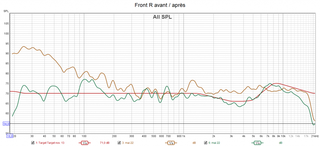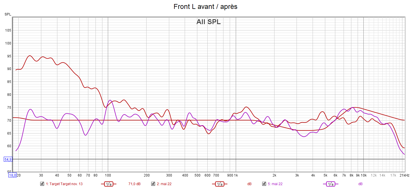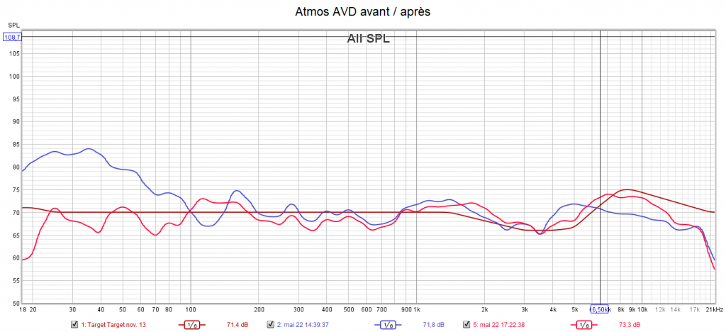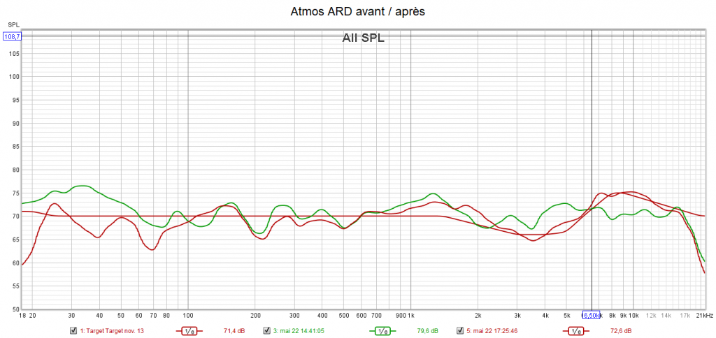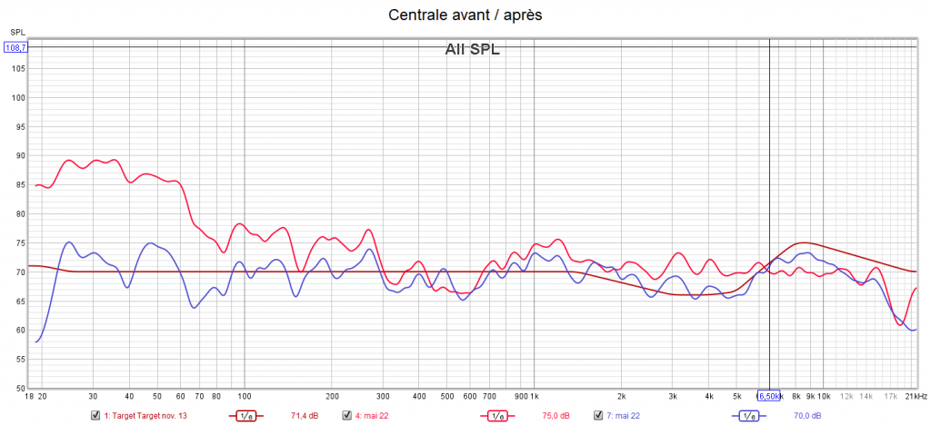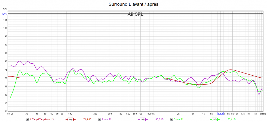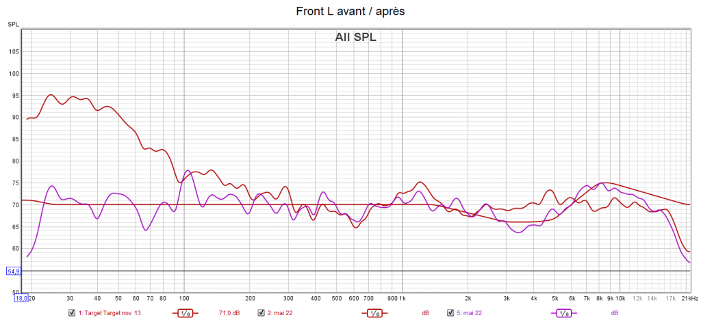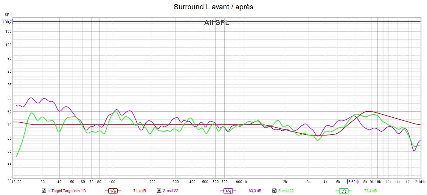 Ci-dessous la correction des canaux Frontaux LCR, 2 atmos et une surround. Le grave a retrouvé un niveau cohérent. Les corrections ont été appliquées selon la nouvelle courbe cible.