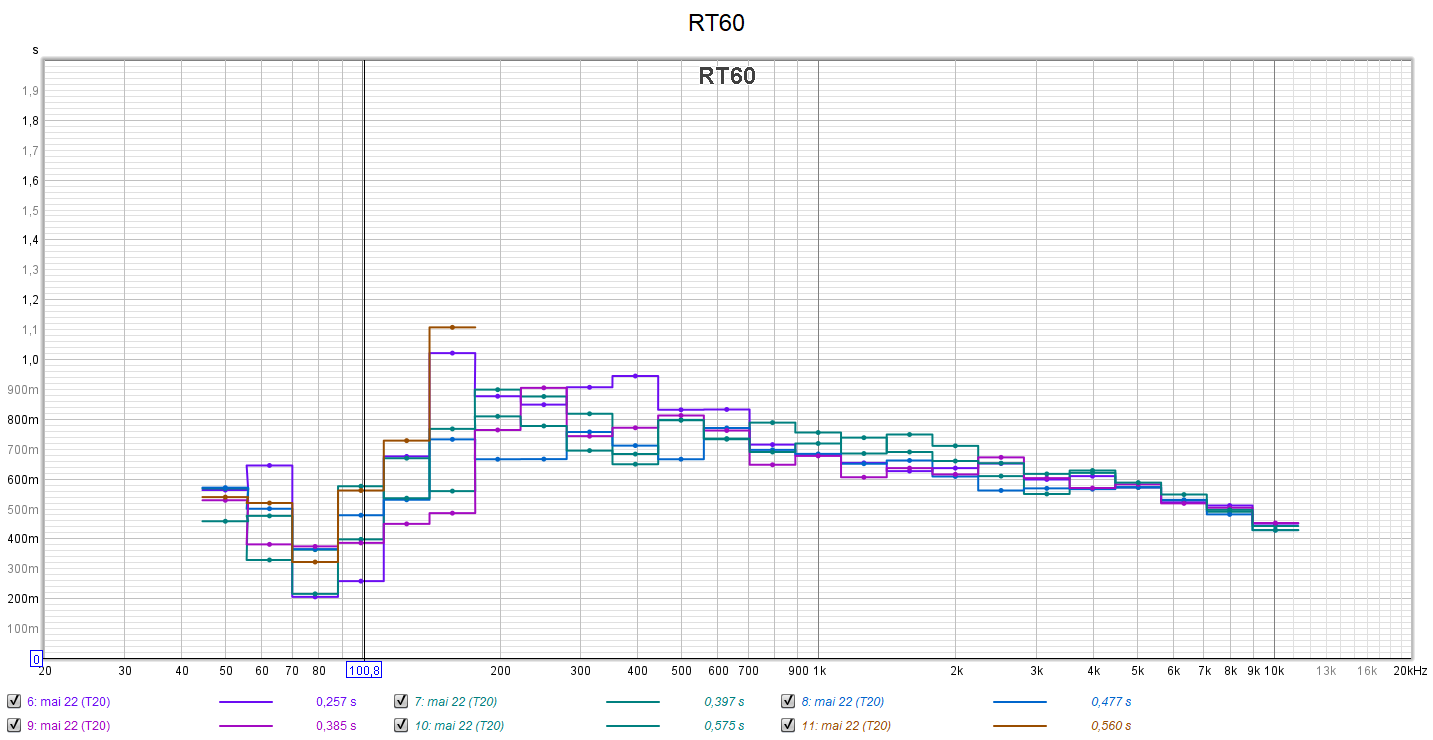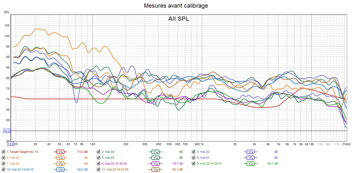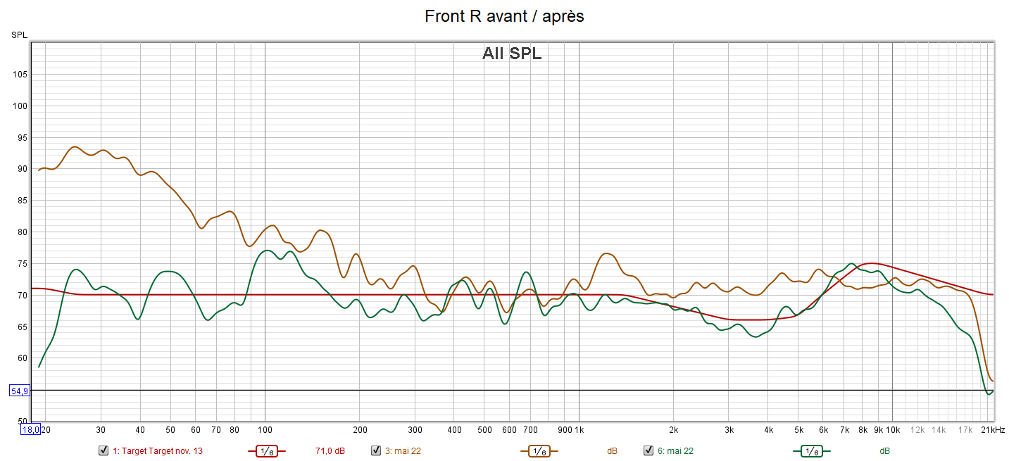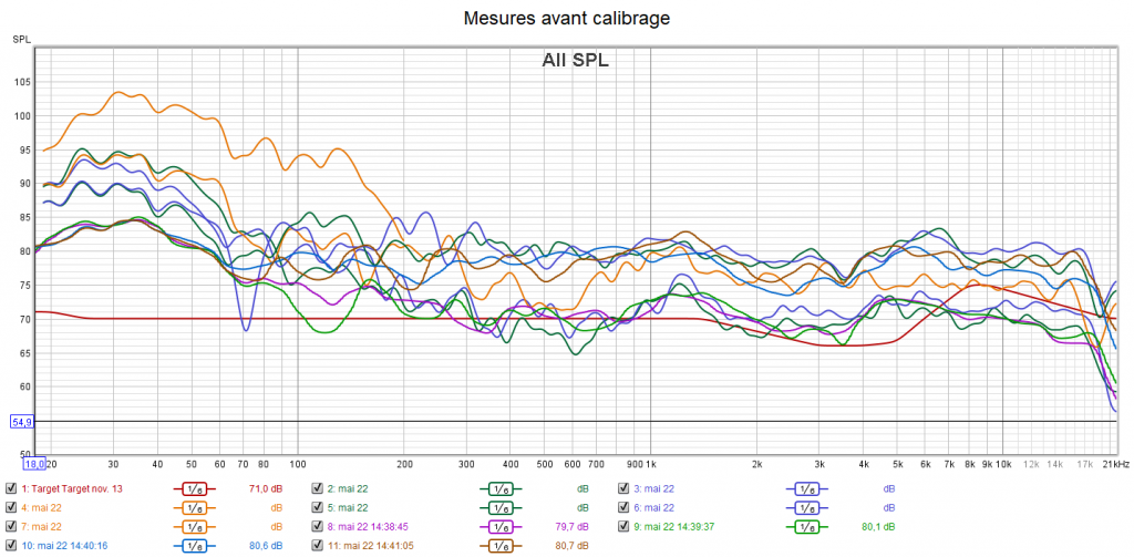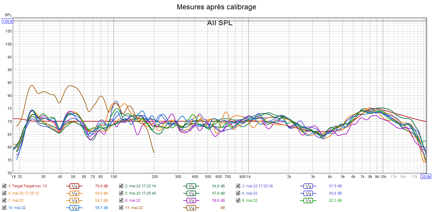 Ci-dessous la correction des canaux Frontaux LCR, 2 atmos et une surround. Le grave a retrouvé un niveau cohérent. Les corrections ont été appliquées selon la nouvelle courbe cible.