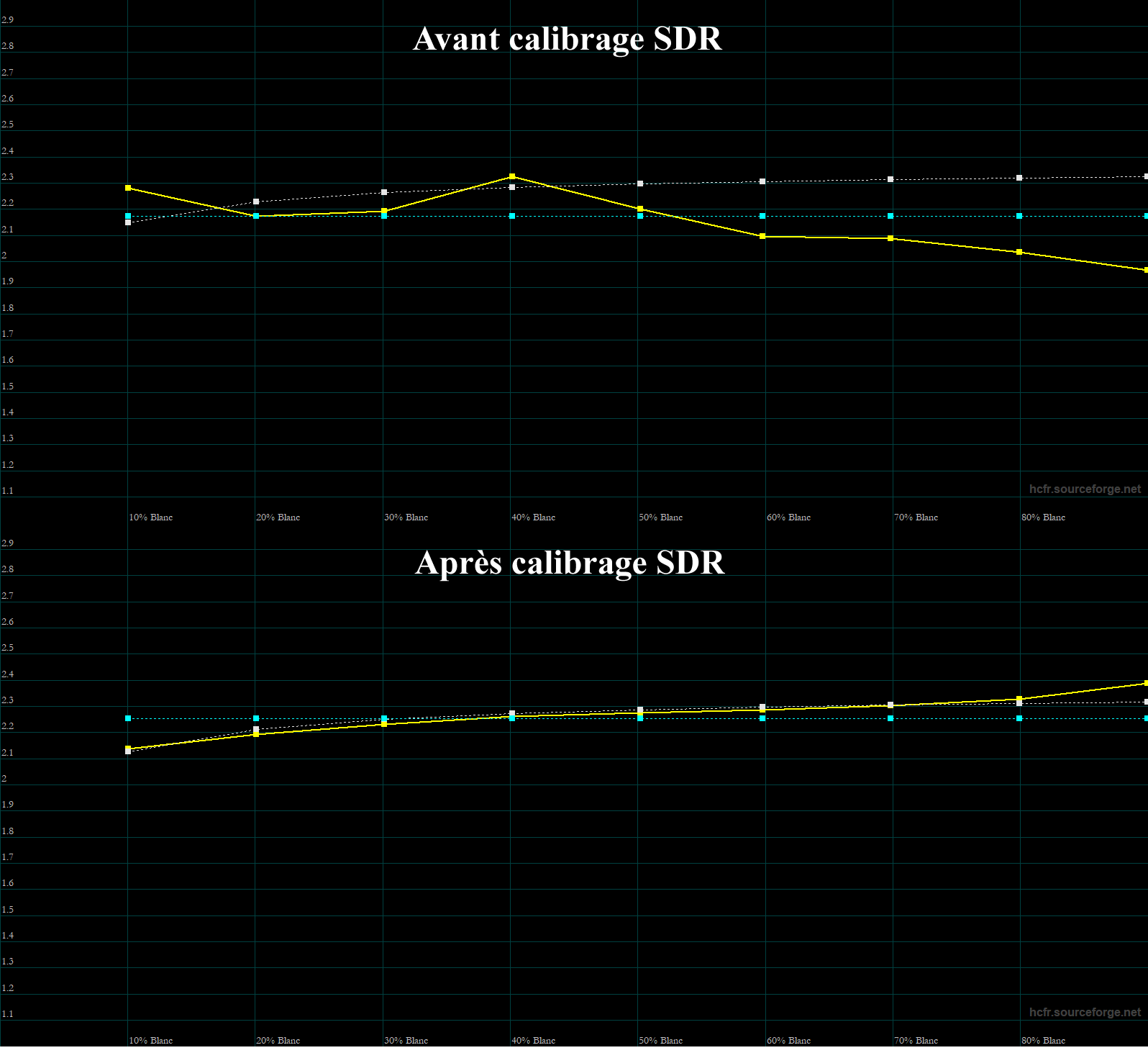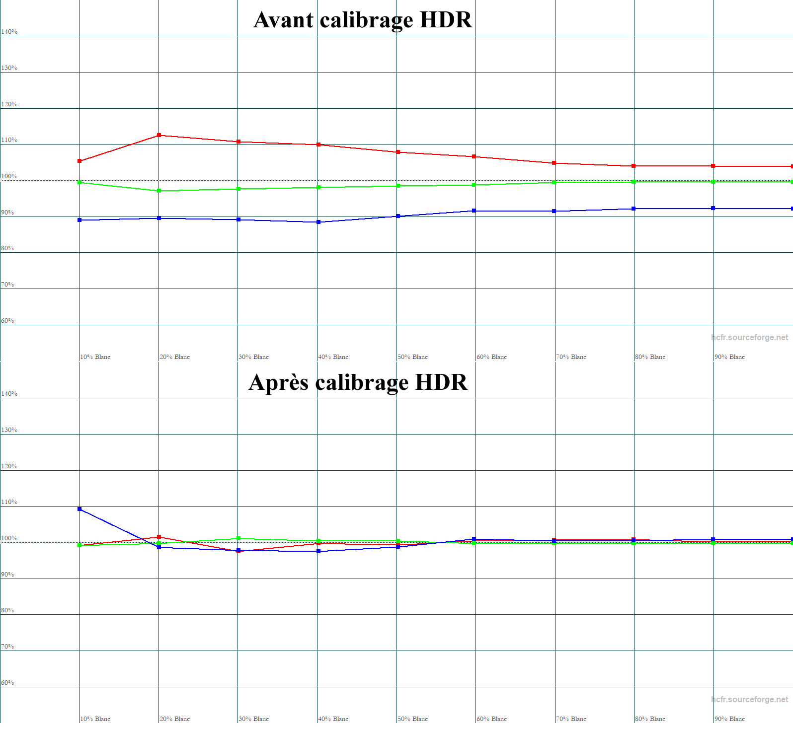 Après calibrage HDR, toute la luminosité du VP est exploitée. Le pic HDR atteint 126 nits avec le 50% qui passe à 44 nits. Ce qui est bien mieux pour des images lumineuse, détaillées et dynamiques. La correction de la balance des blancs amène son delta E moyen à 0,7. Les basses lumières sont légèrement augmentées grâce au mapping HDR de l’UB820.