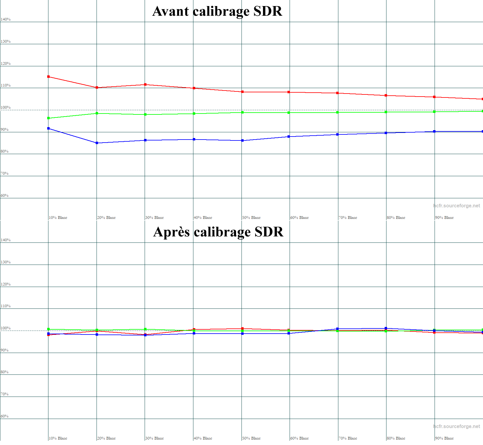 Après calibrage SDR, le Delta E moy de la balance des blancs descend à 0,6. J’obtiens 70 nits pour le pic de luminance. C’est toujours bien lumineux, au dessus de la recommandation, mais je le fais parce que je sais que le HDR pourra être également bien lumineux. La luminosité donne un meilleur rendu, ça serait dommage de ne pas en profiter.