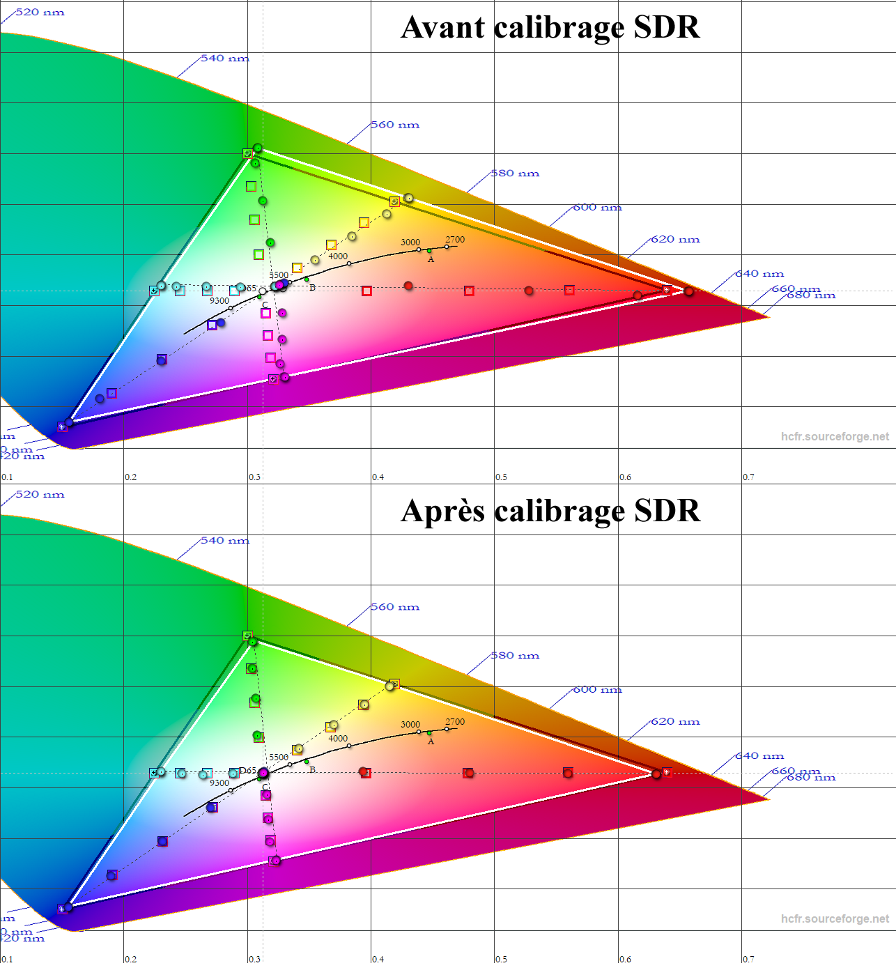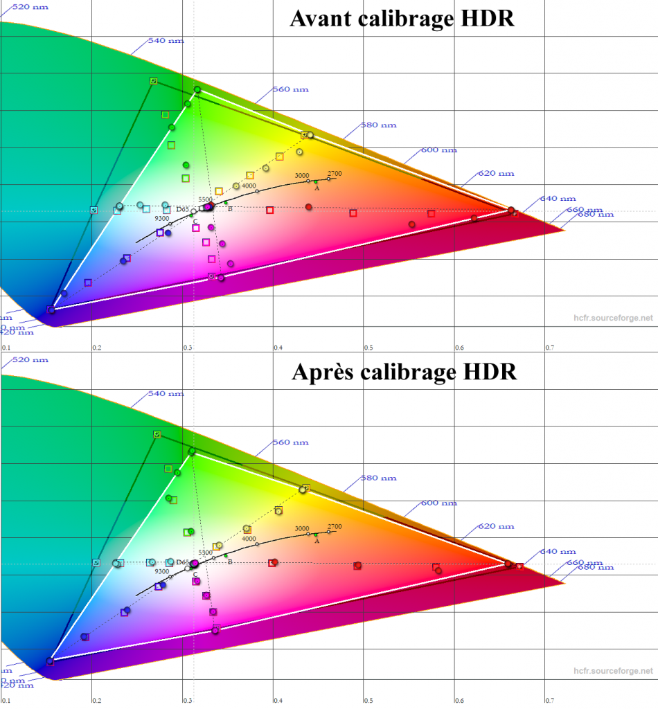 Avant calibrage HDR, en plus du décalage du blanc qui impacte les couleurs, il y a trop de saturation. Le magenta n’a pas la bonne teinte. Le gamut dépasse le REC709 mais ne couvre pas le DCI-P3.