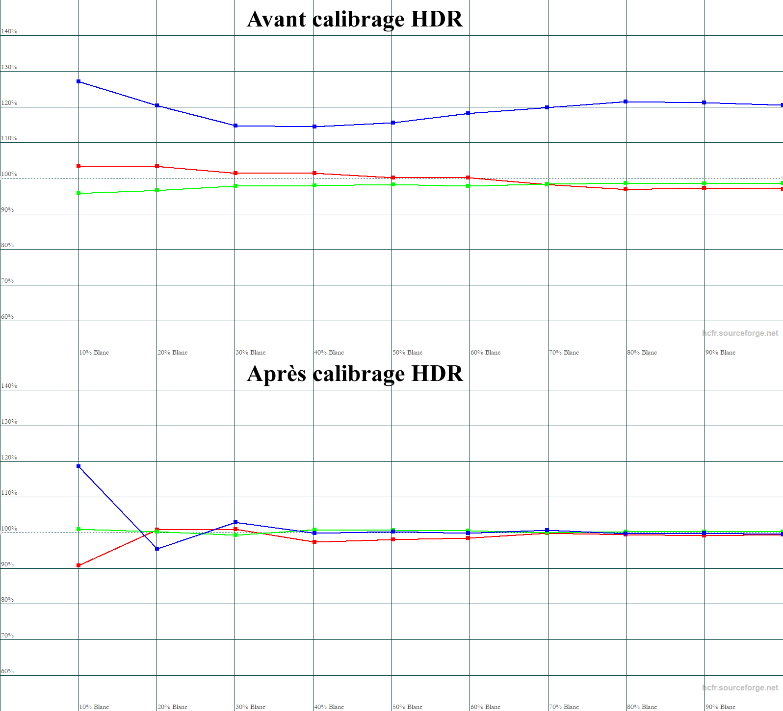 Avant calibrage HDR, je retrouve l’excès de bleu pour la balance des blancs qui donne un delta E moy à 7,1 (max 10,8).