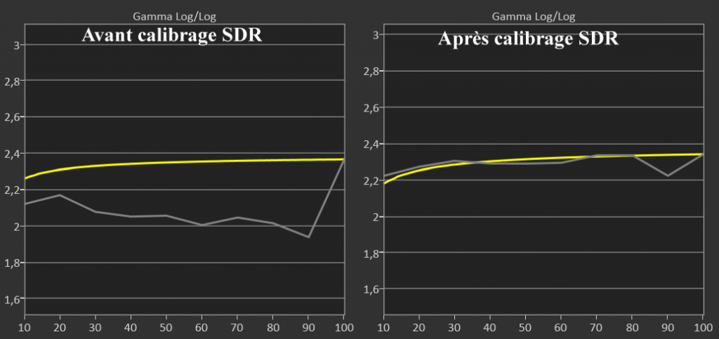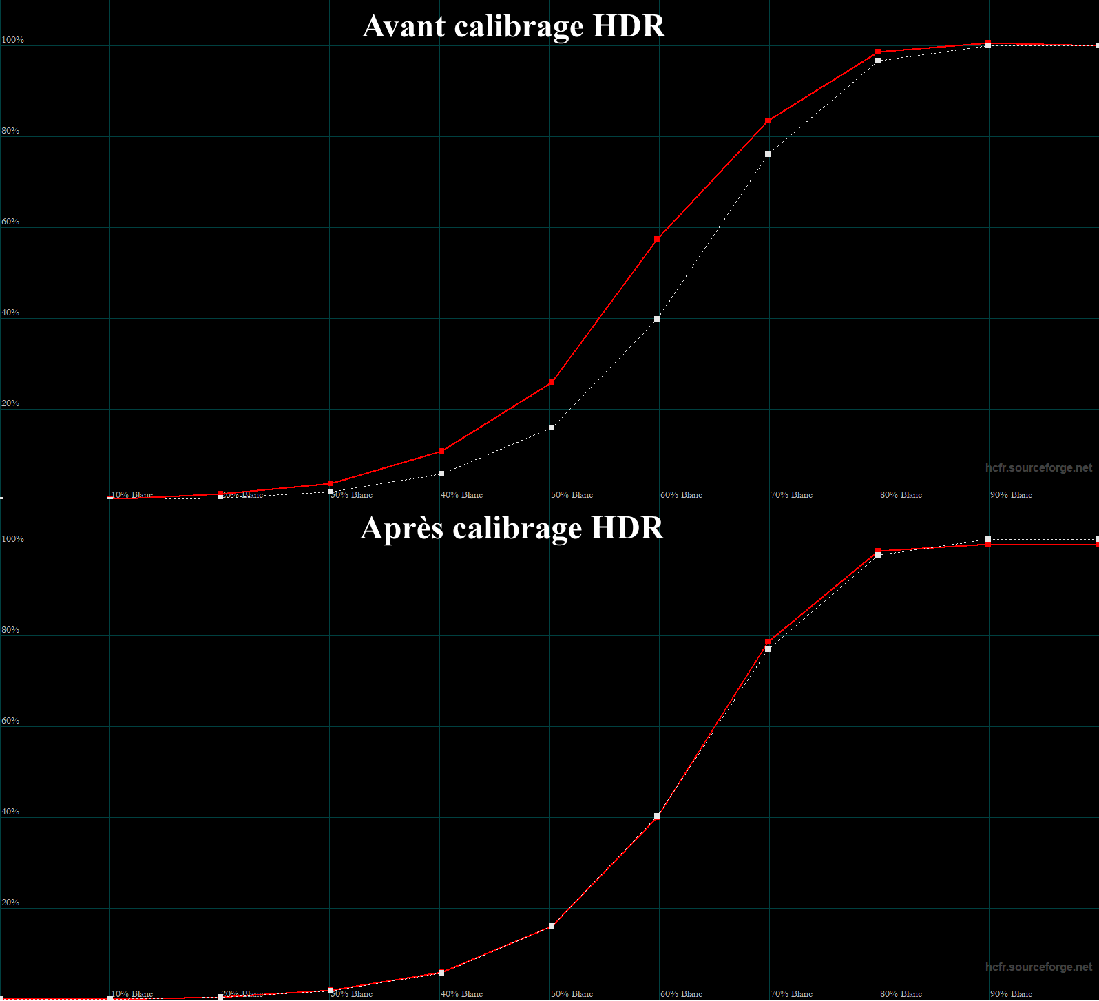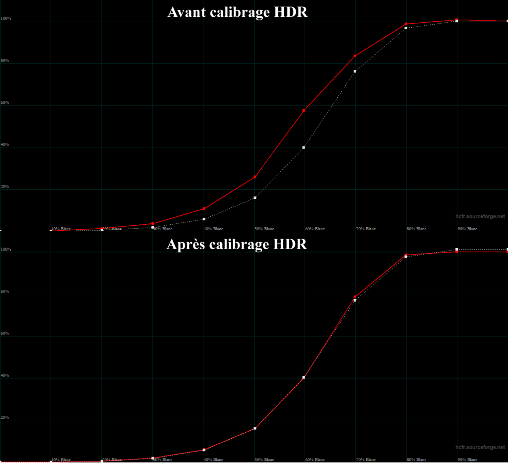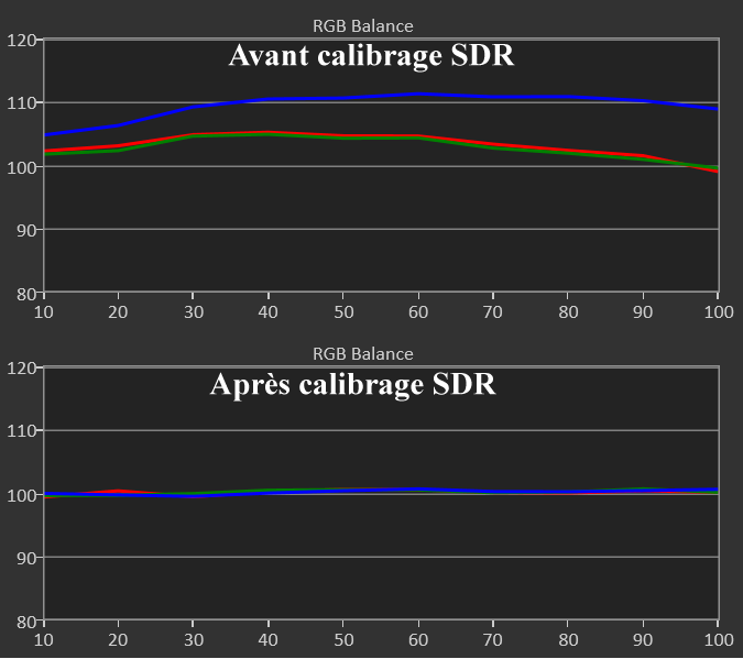 Après calibrage HDR je réalise le calibrage avec le tone mapping désactivé pour ne pas influer sur la luminance des mires. J’ai toujours une bonne précision sur la balance des blancs avec un delta E moy à 0,8 (max 1,2)