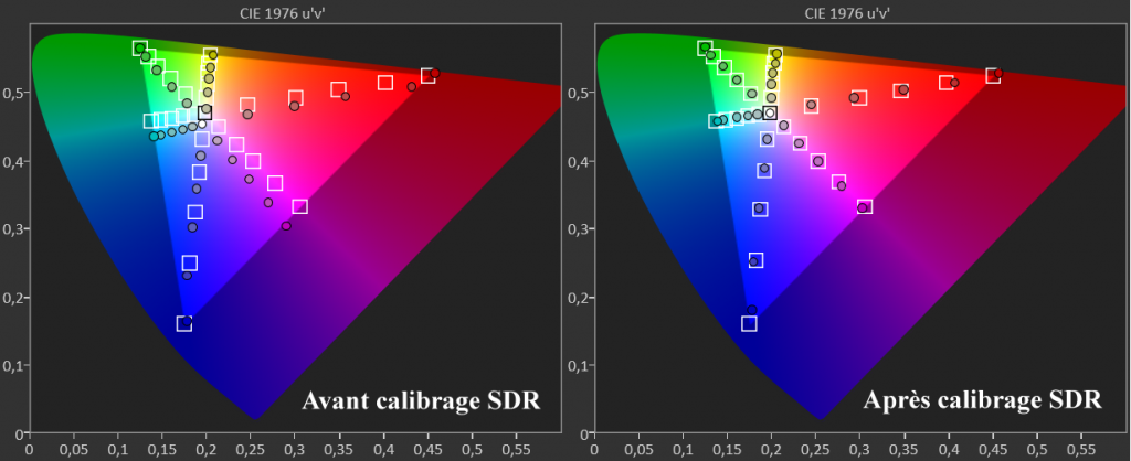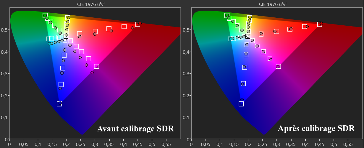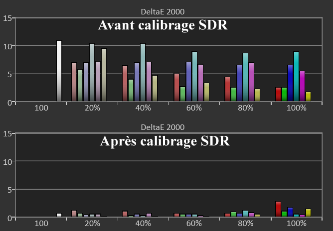 Après calibrage HDR, la correction des couleurs se fait très bien avec un delta E moy qui tombe à 1,2 dans le DCI-P3. On ne le couvre pas à 100%.