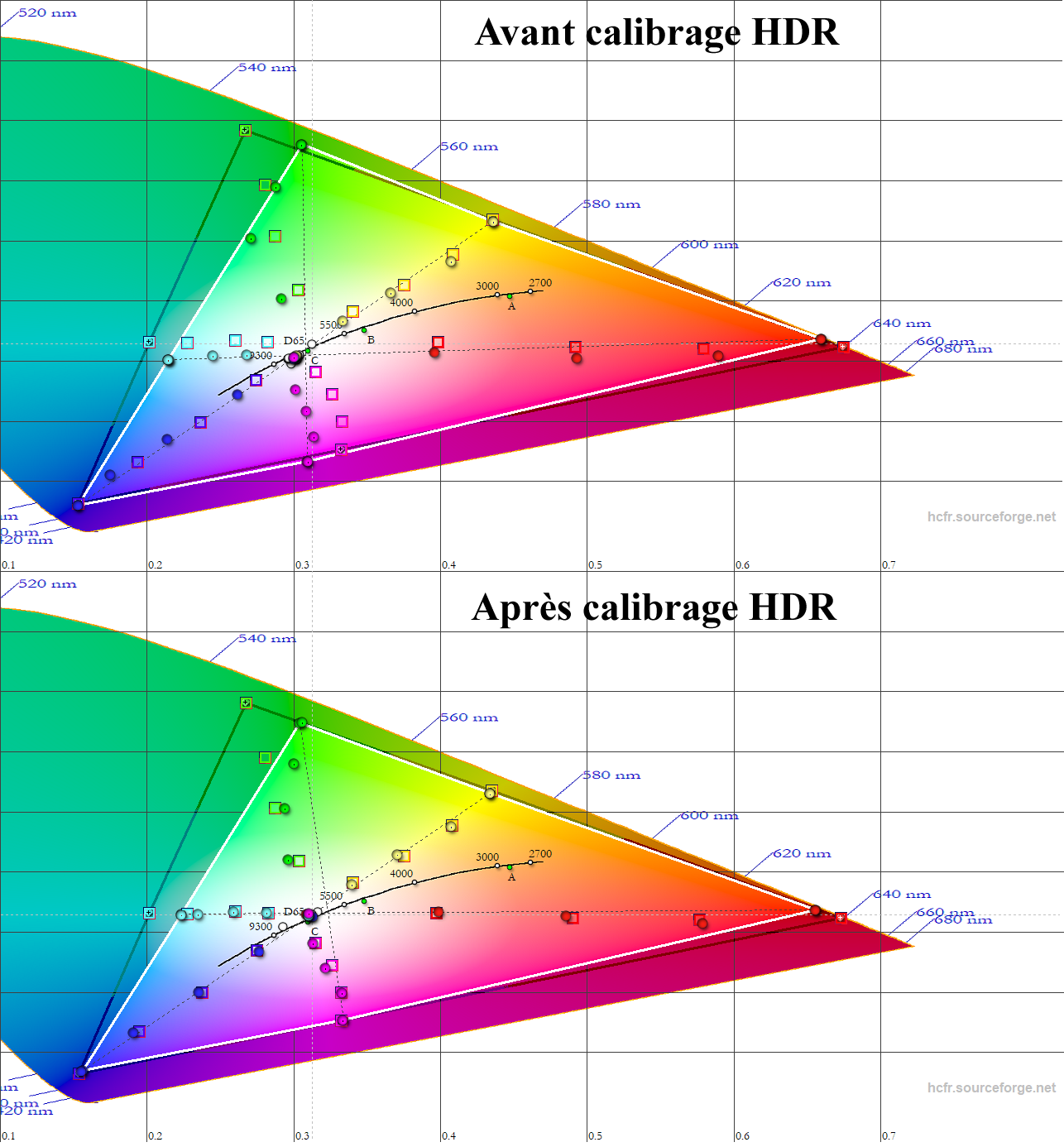 Avant calibrage HDR, les couleurs sont décalées à cause de l’excès de bleu et ont un excès de saturation comme en SDR. Le gamut visé est le DCI-P3, plage étendue par rapport au BT709. Mais il est rare de le couvrir à 100%. Le delta E moy des couleurs est à 5,8.