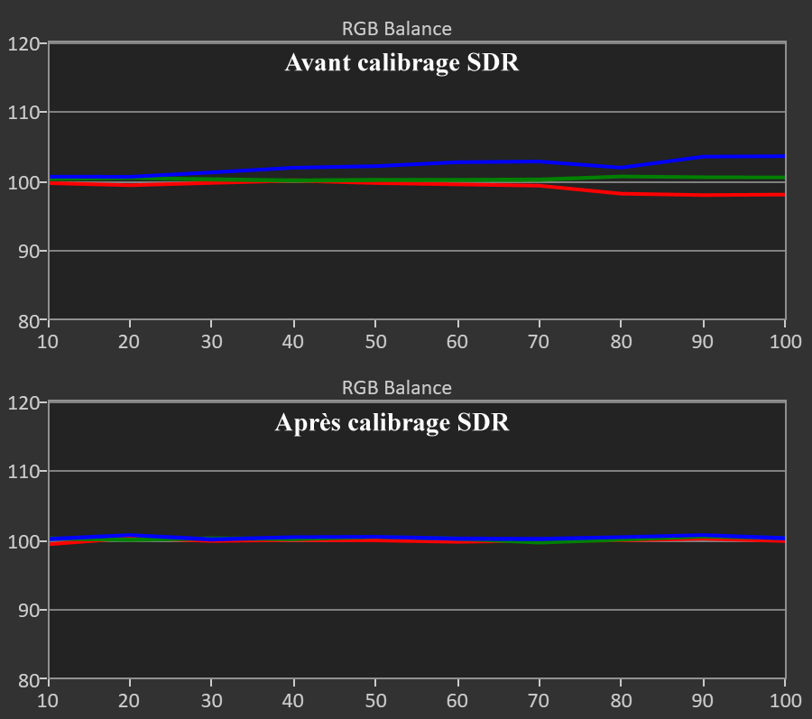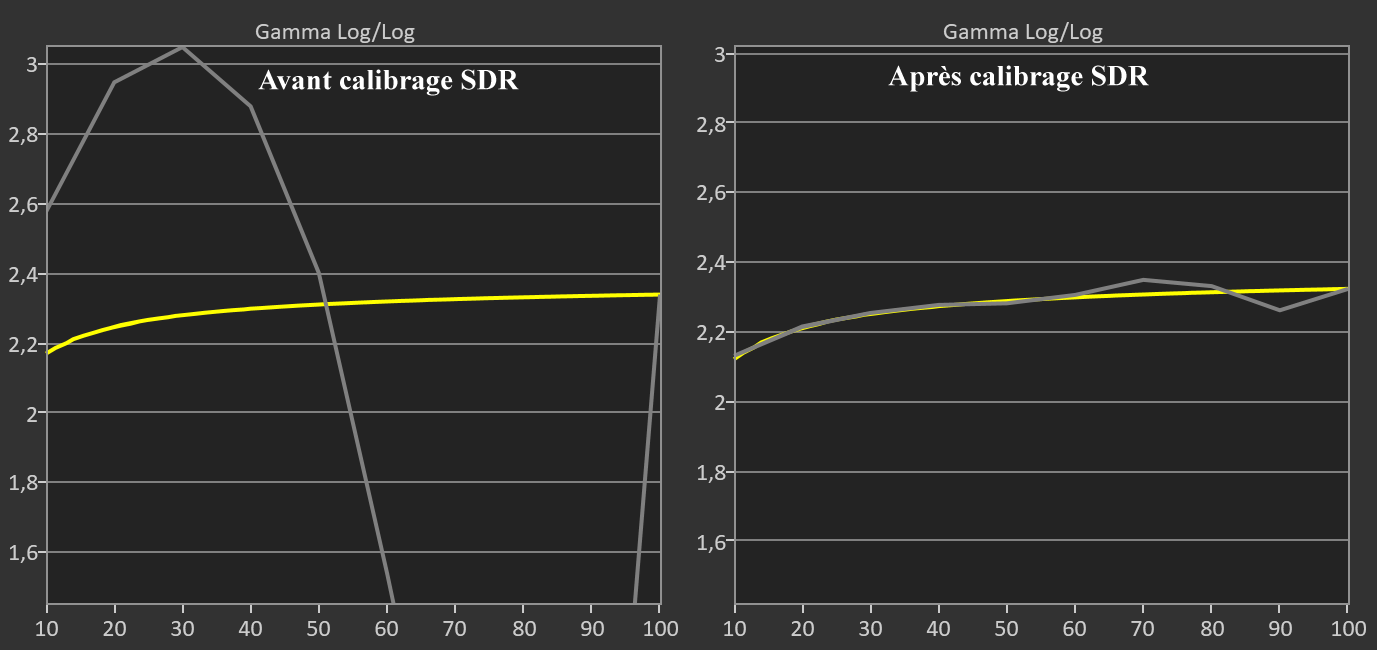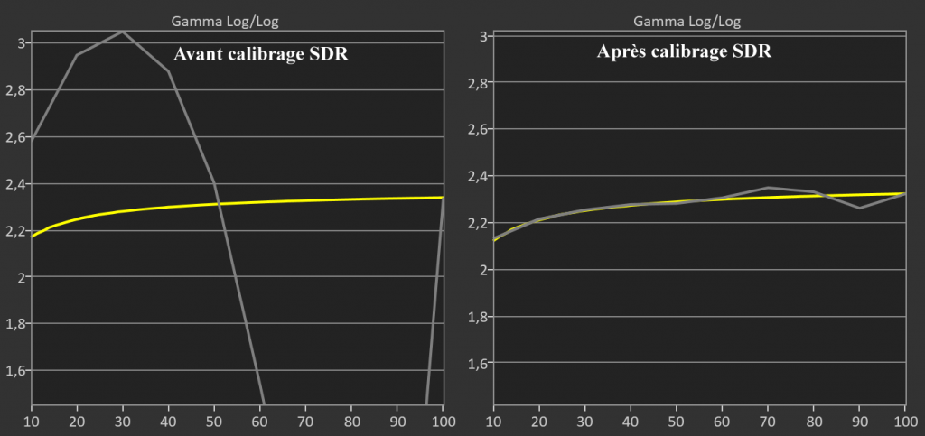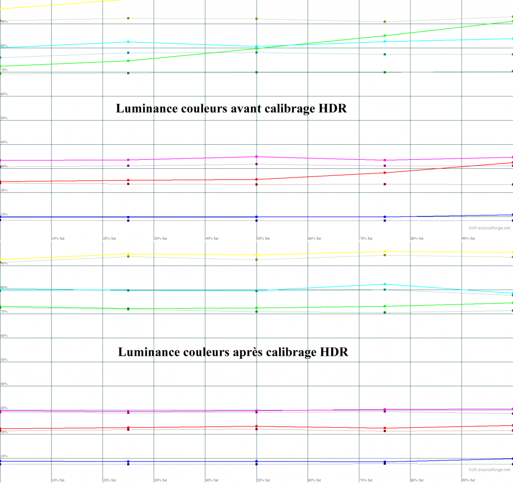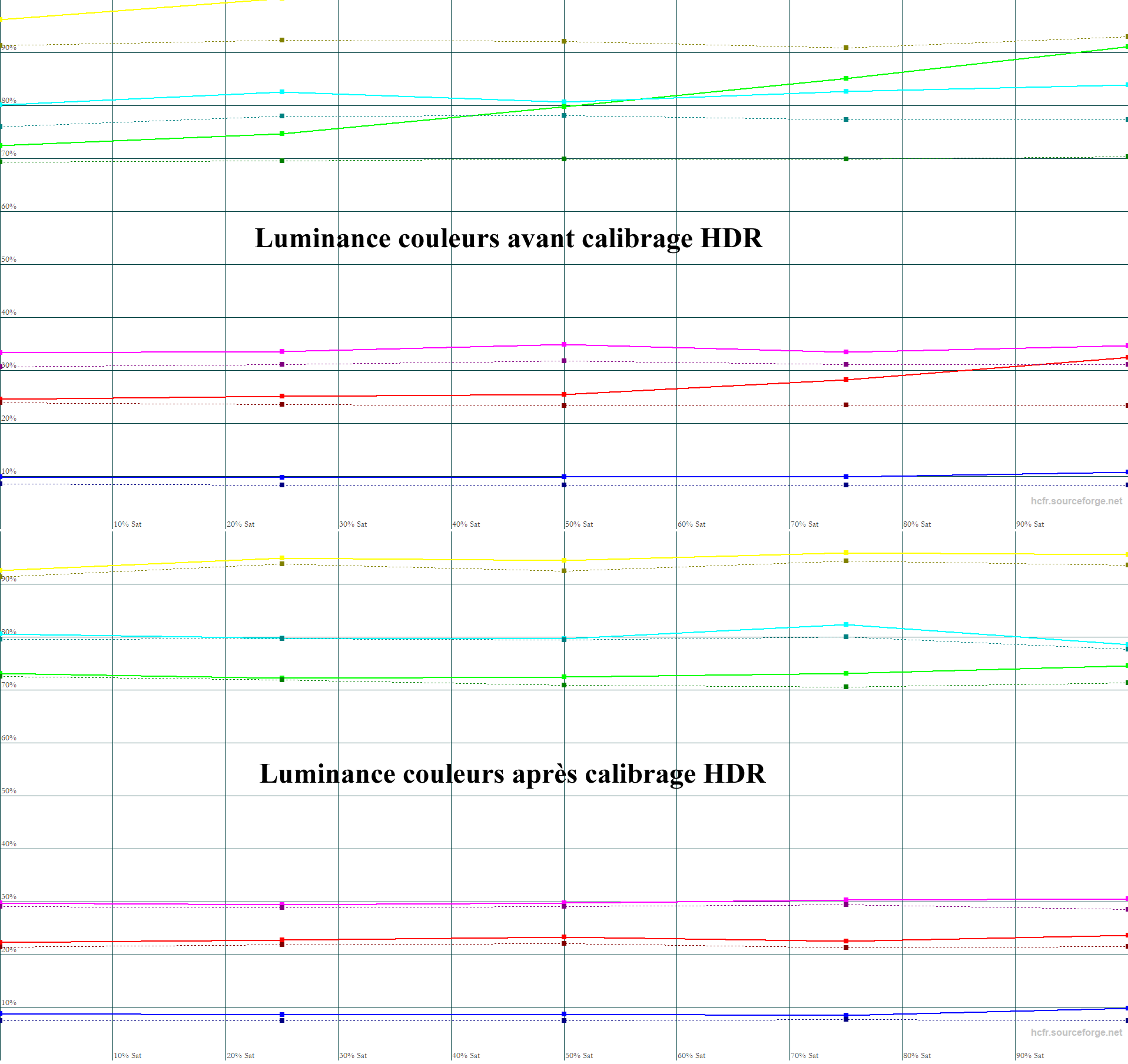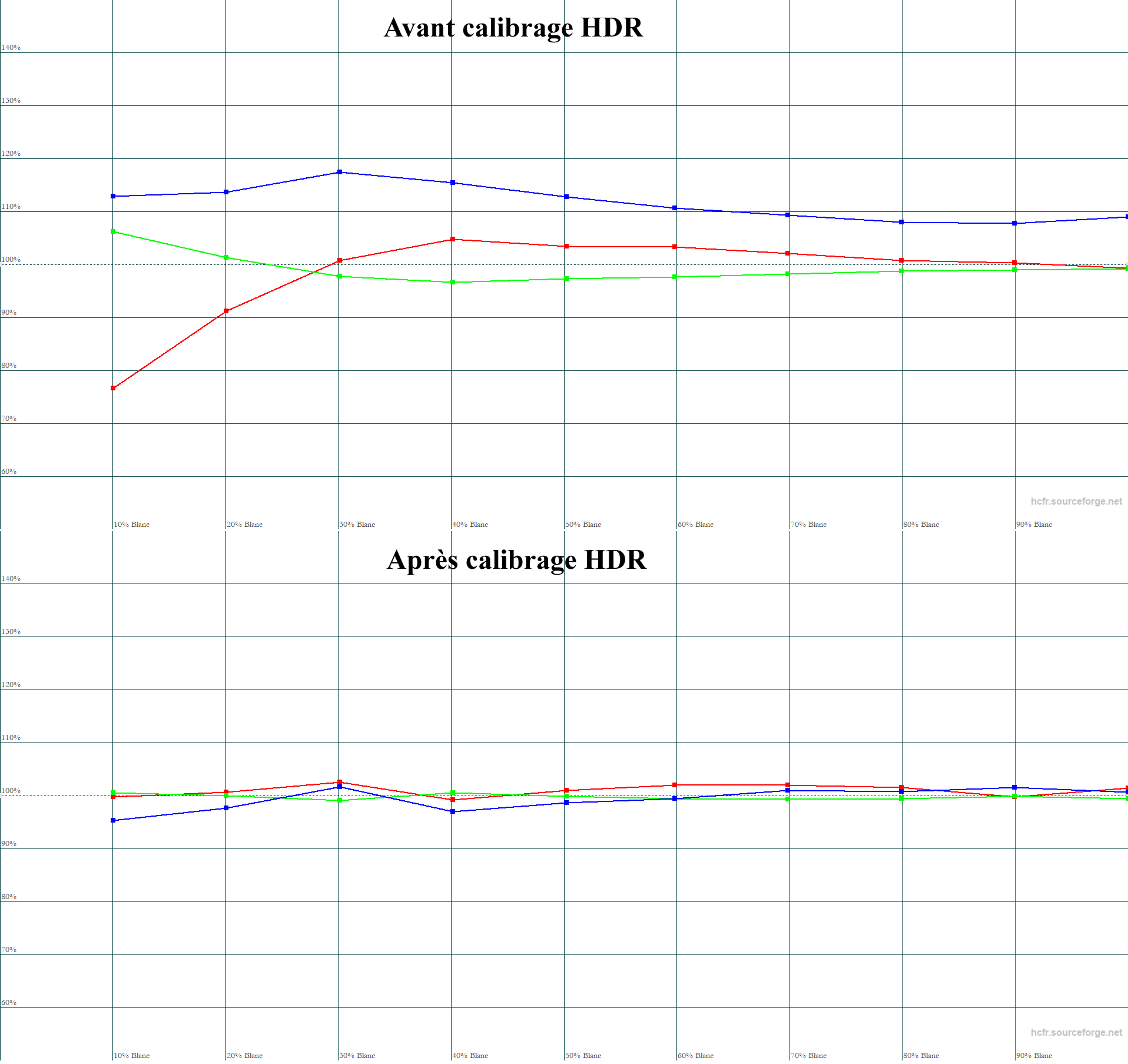 Après calibrage HDR, j’obtiens un delta E moy à 1 (max 1,8) pour la balance des blancs. Le pic de luminance monte à 120 nits (lampe moyenne) et le 50% à 32 nits. Ce qui donne une bonne courbe de luminance pour un bon rendu HDR.