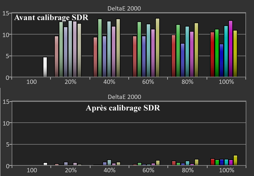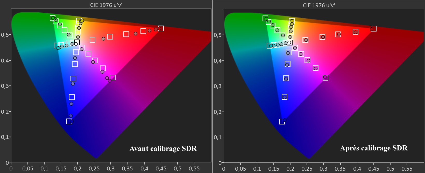 Après calibrage : J’ai calibré les couleurs REC2020 dans l’espace REC709. Le VP ne dépasse pas cet espace dans lequel toutes les couleurs ont un delta E inférieur à 2. On pourrait dépasser le REC709 avec le mode Cinéma Numérique, mais on perd trop en luminosité, ce qui n’est pas compatible avec le HDR.