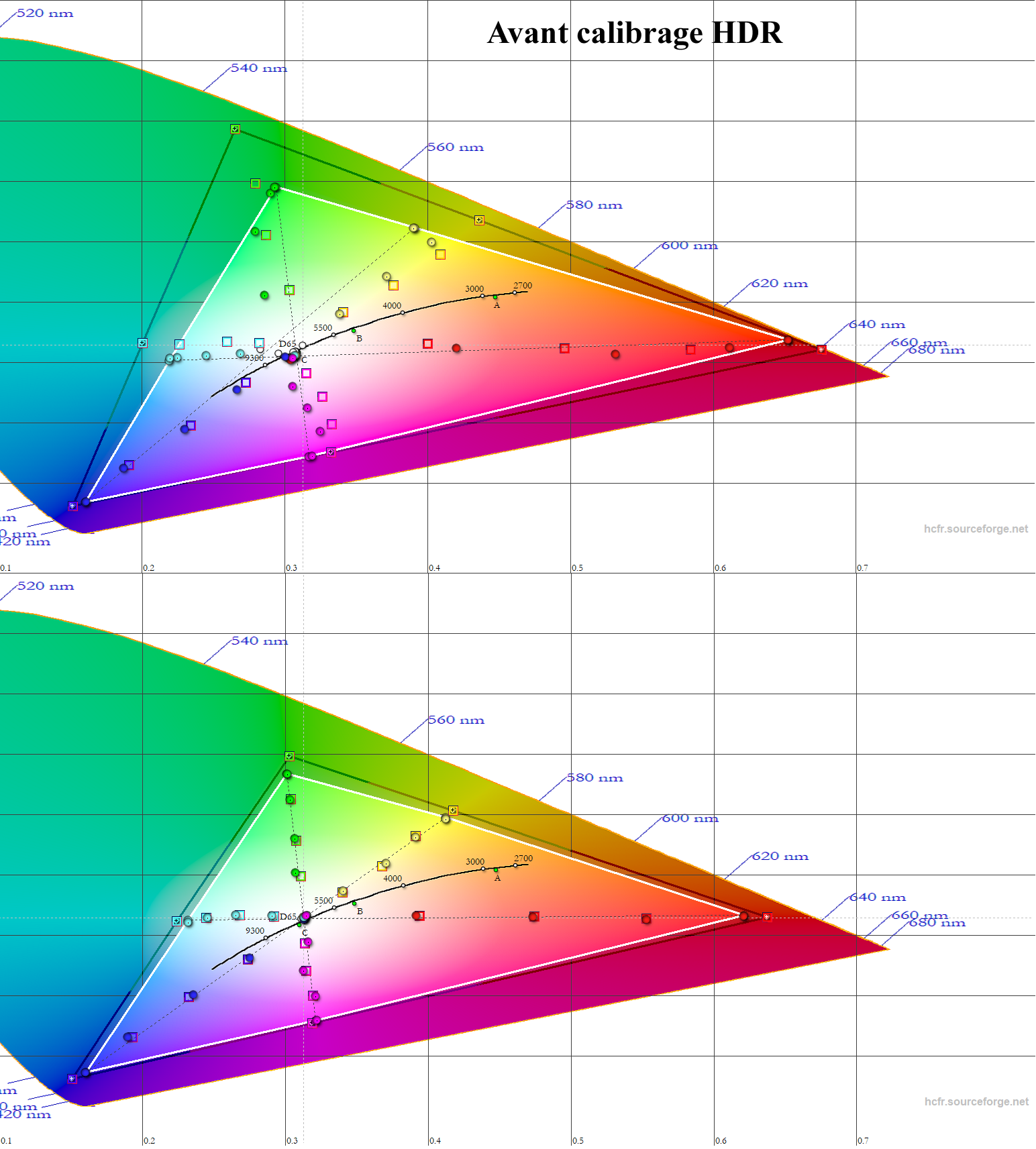 Avant calibrage HDR, la plage colorimétrique ne dépasse pas le REC709. Les couleurs ont toutes des défauts de saturation et/ou de teintes pour un delta E moy à environ 4.