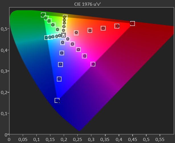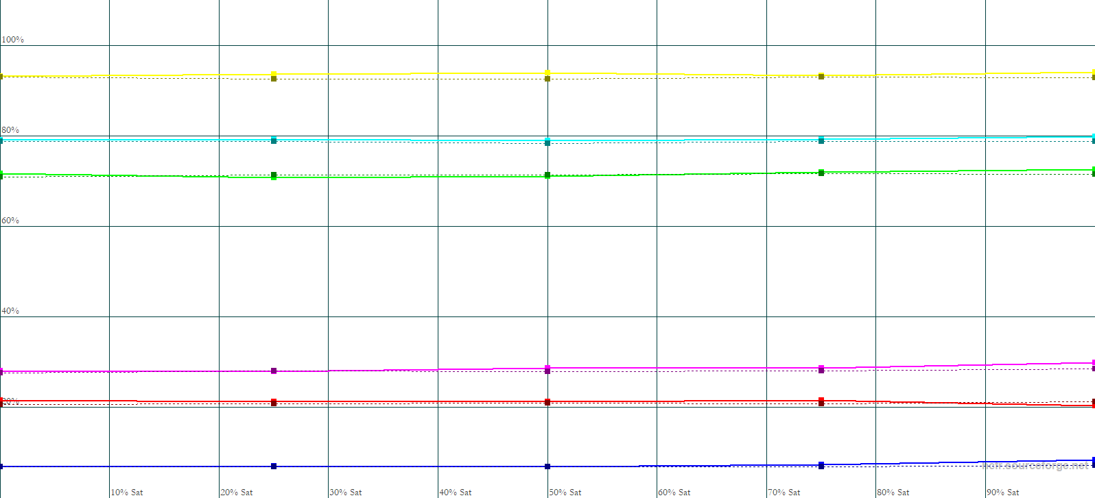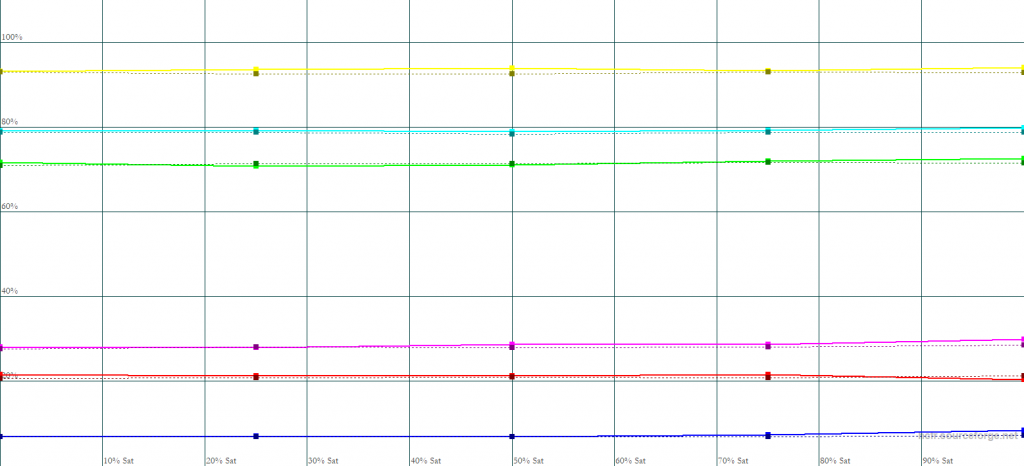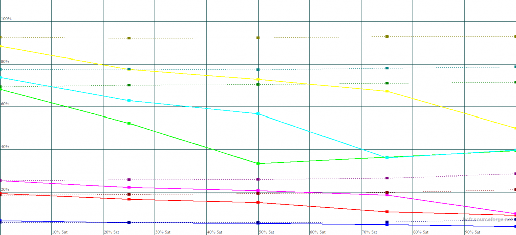 Si les téléviseurs s’en sortent très bien, ce n’est pas toujours le cas pour les vidéoprojecteurs. On peut observer une différence de luminance entre le blanc et les couleurs. C’est à dire que la luminance des couleurs chutent au fur et à mesure que les couleurs sont saturées. C’est ce que montre le relevé du haut ci-contre. Le calibrage ne peut pas combler ce problème technique. C’est pour cela que certains fabricants mentionnent une luminosité en lumens pour le blanc ainsi que pour les couleurs. Le relevé du bas montre une très bonne tenue des luminances dans la saturation des couleurs.
