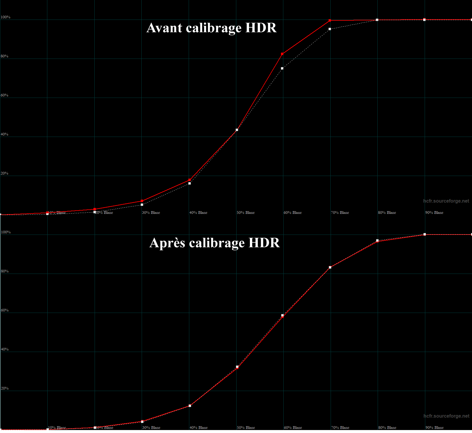 Cette courbe est spécifique au HDR et représente LA difficulté des afficheurs. La luminosité max varie en fonction de l’étalonnage des films. Et cette luminosité max dépasse généralement les capacités des afficheurs actuels surtout en vidéoprojection. C’est pourquoi les afficheurs doivent procéder à du tone mapping (adaptation de l’échelle de luminosité) pour faire correspondre la plage dynamique initiale avec celle qu’il sait reproduire. Cette adaptation est plus ou moins bien faite en fonction des appareils. Et donc cela conditionne en grande partie le détail dans les hautes lumières tout comme le détail dans les basses lumières.