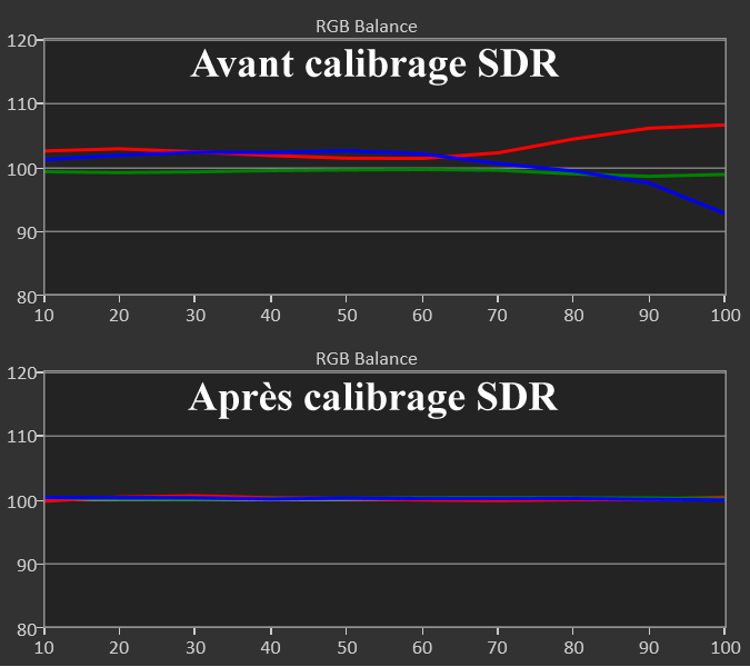 La balance des blancs s’effectue sur toute le plage de luminosité du blanc : de 0% qui est le noir jusqu’au 100% qui est le blanc le plus lumineux (luminosité exprimée en nits). On y verra entre ces 2 extrêmes toutes les nuances de gris. Une bonne balance des blancs est primordiale avant d’entreprendre le calibrage des couleurs.