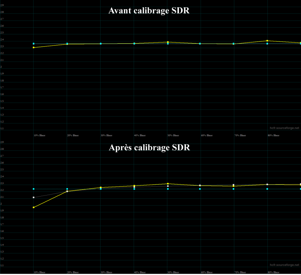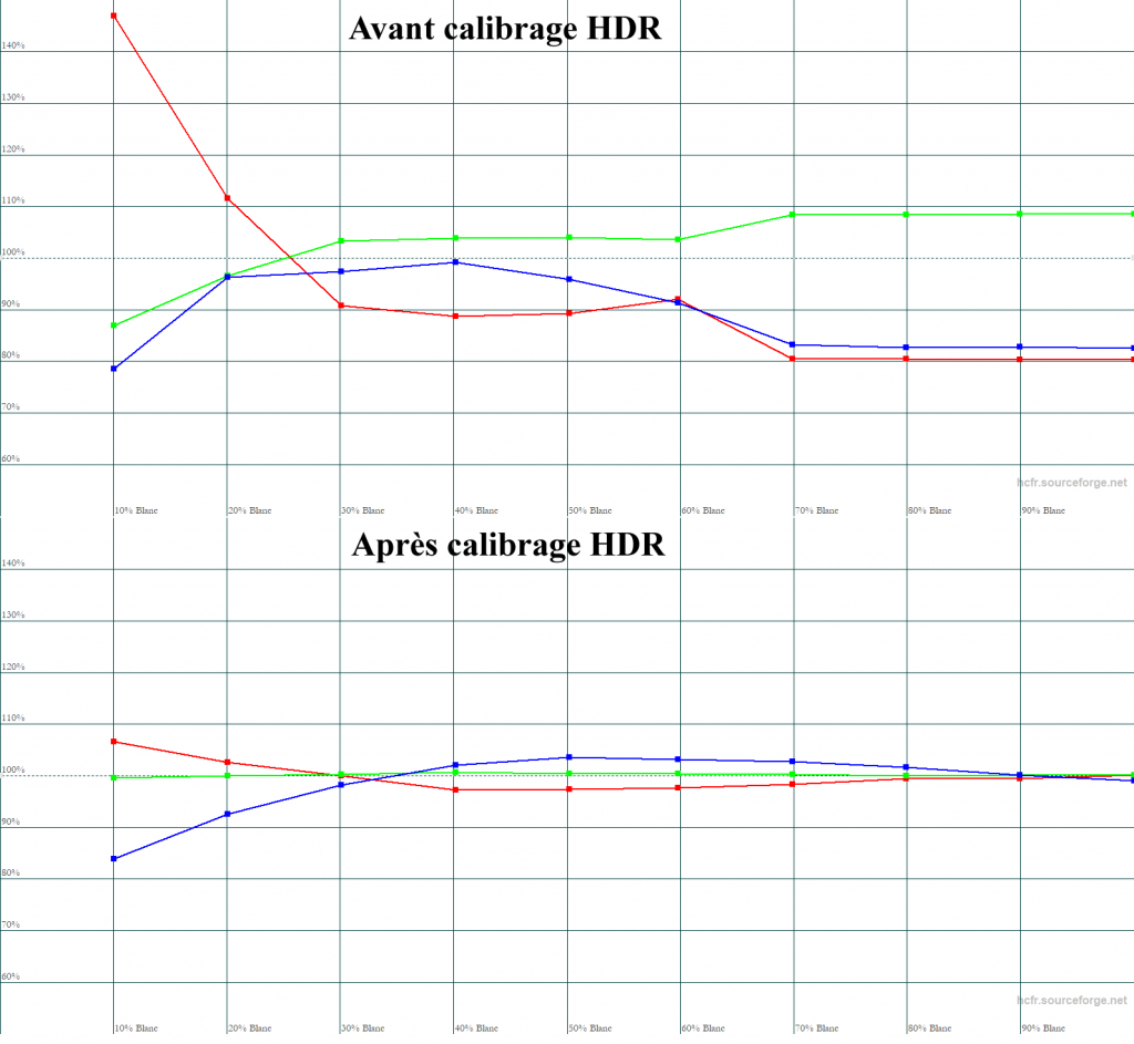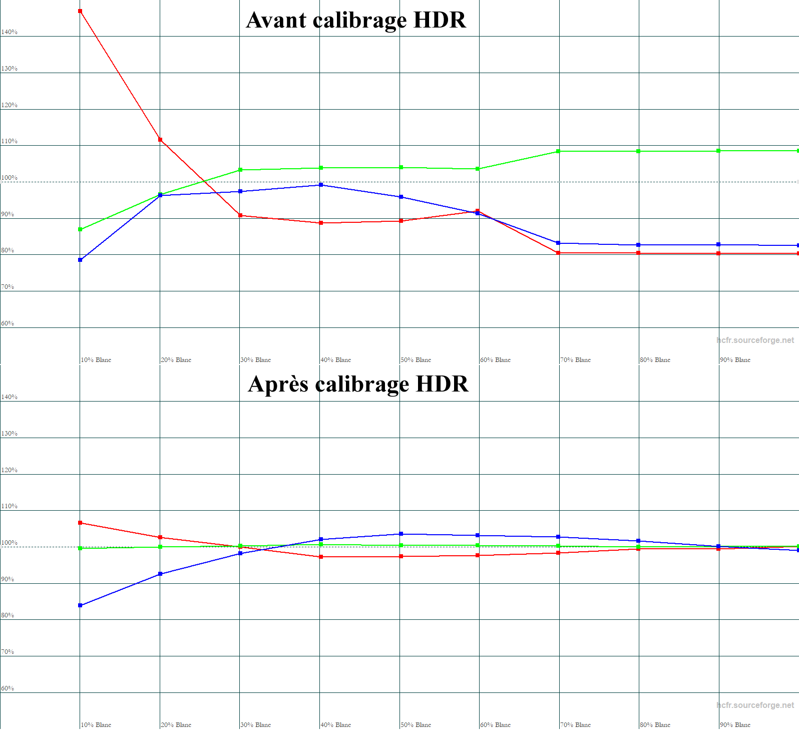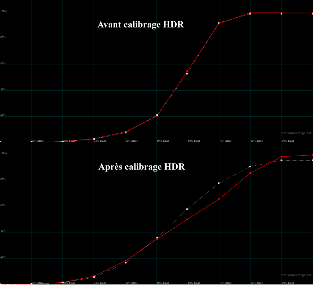 Après calibrage HDR : la lampe passe en « haute » pour exploiter toute la luminosité du VP. Le mode FrameAdapt est utilisé pour le mapping HDR et le Theater Optimizer a été paramétré pour optimiser également le mapping HDR. Le Delta E moy de la balance des blancs passe à 1,4. Le pic HDR monte à 97 nits. 34 nits pour le blanc à 50%. De bonnes valeurs pour un bon rendu HDR.