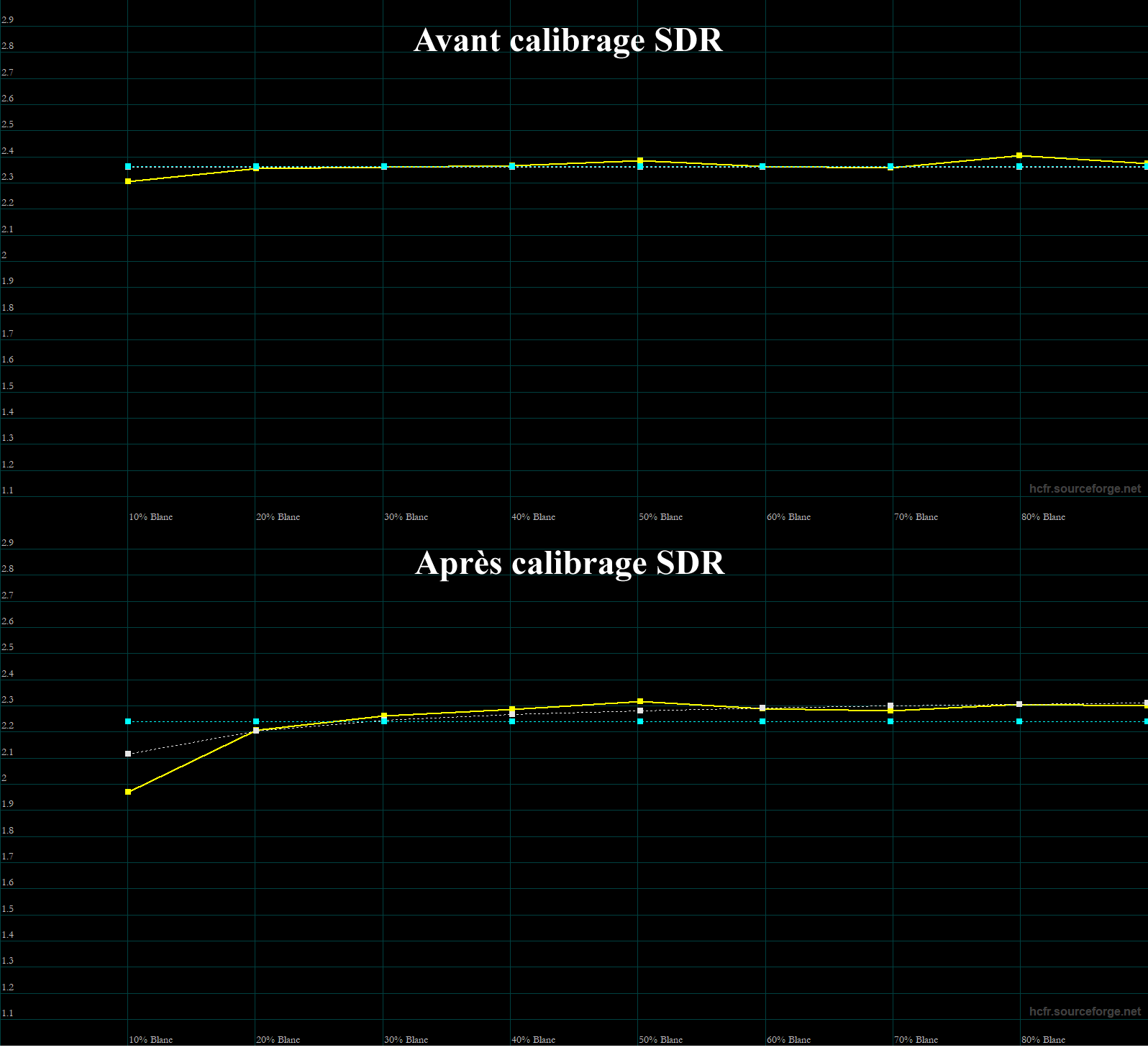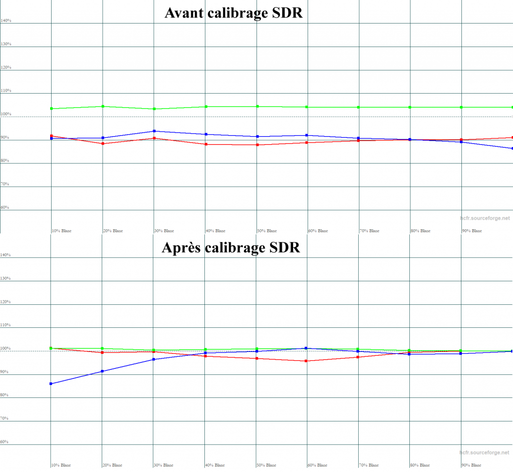 Avant calibrage SDR : La balance des blancs présente un excès de vert avec un delta E moy à 5,7 (max toléré 2). Le pic de luminance atteint 77 nits. C’est un peu excessif, la recommandation étant à 48 nits.